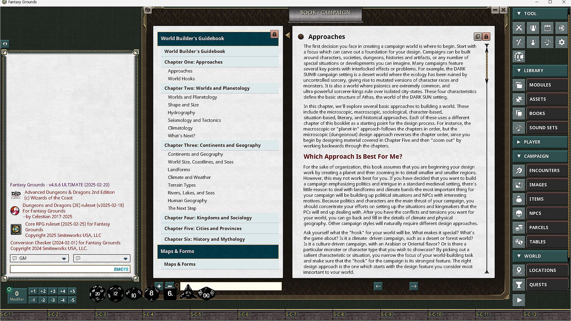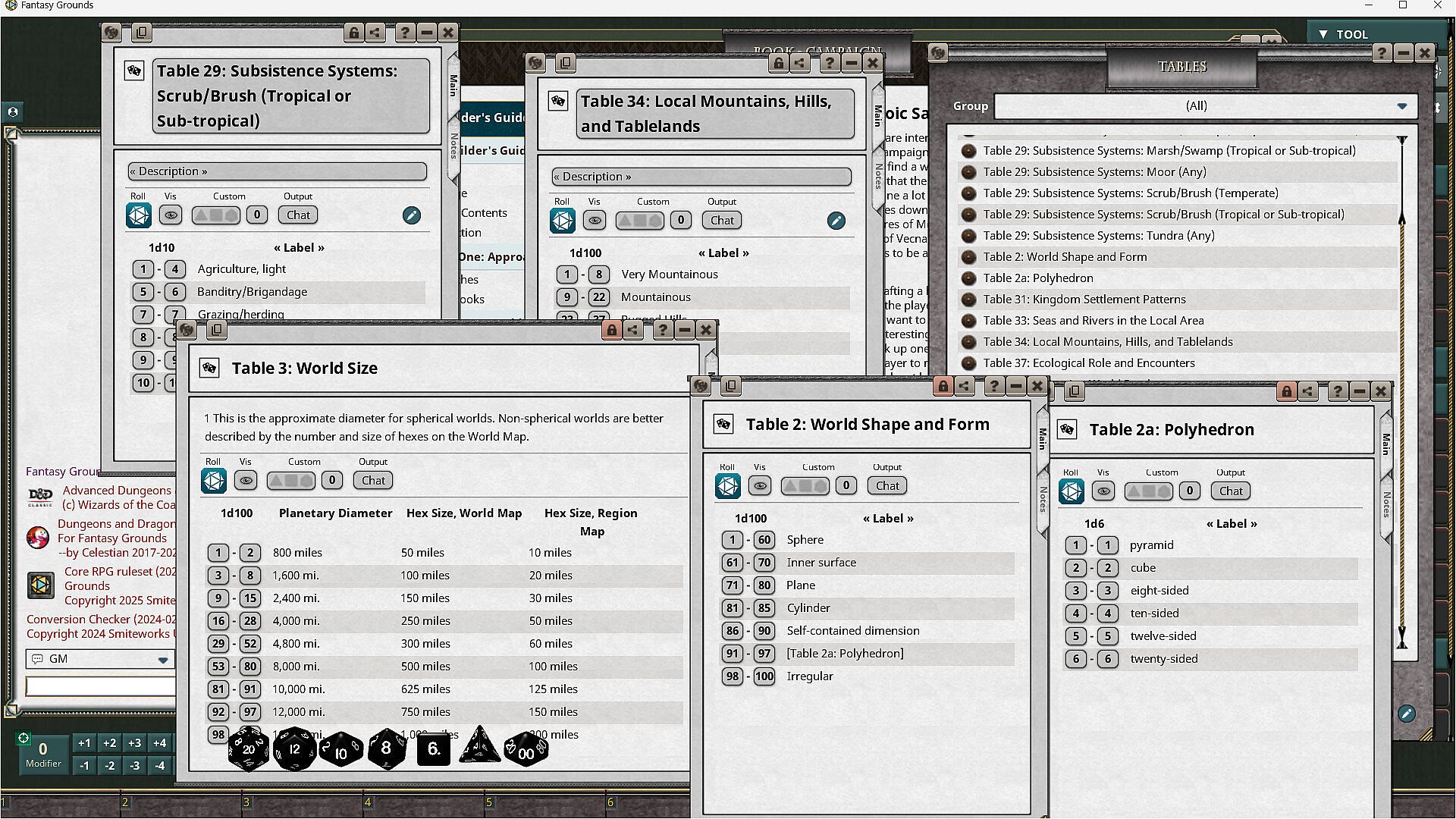 Guidelines and random tables for creating continents, kingdoms, societies, local areas, towns and cities, ecologies, pantheons, histories, and sites of interest