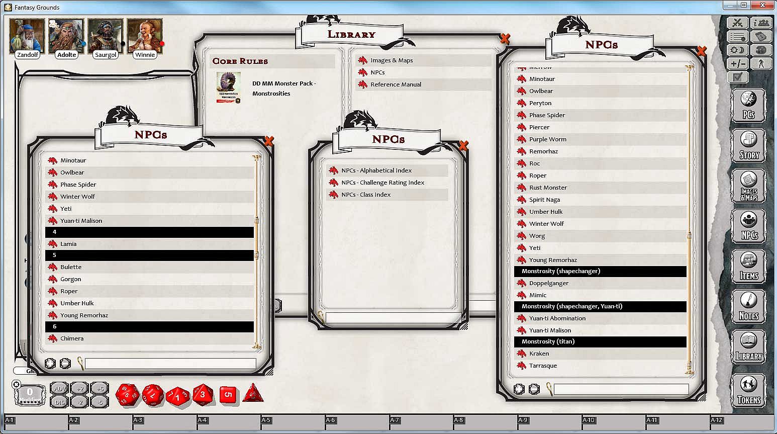- Full stats for all monstrosity monsters in the D&D Monster Manual, created as NPC records within Fantasy Grounds for use in building encounters and to help automate attacks and abilities in combat