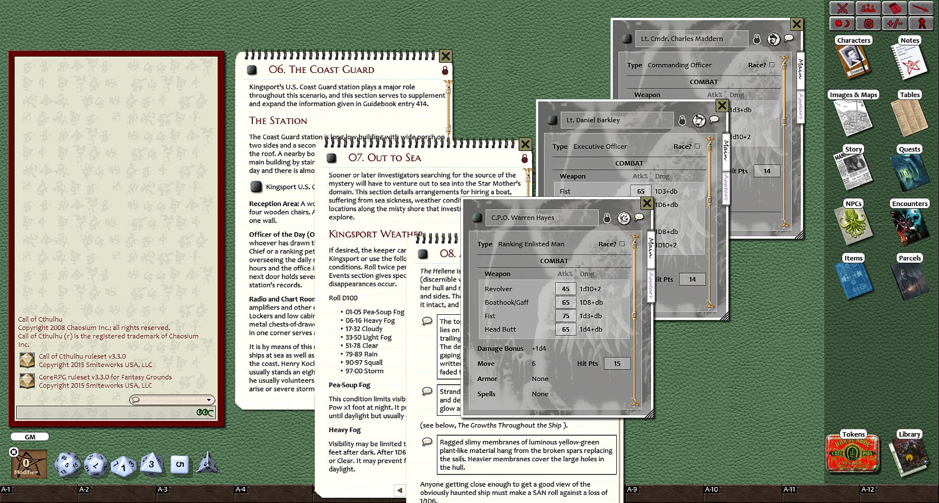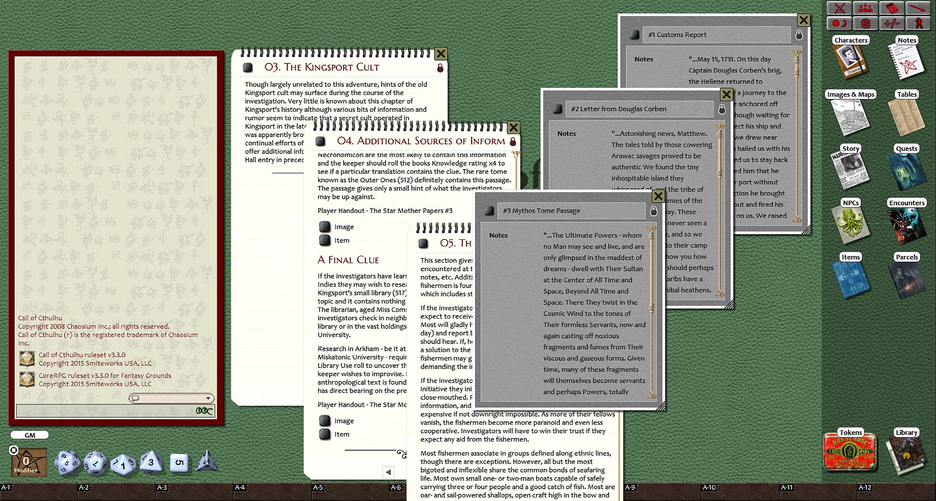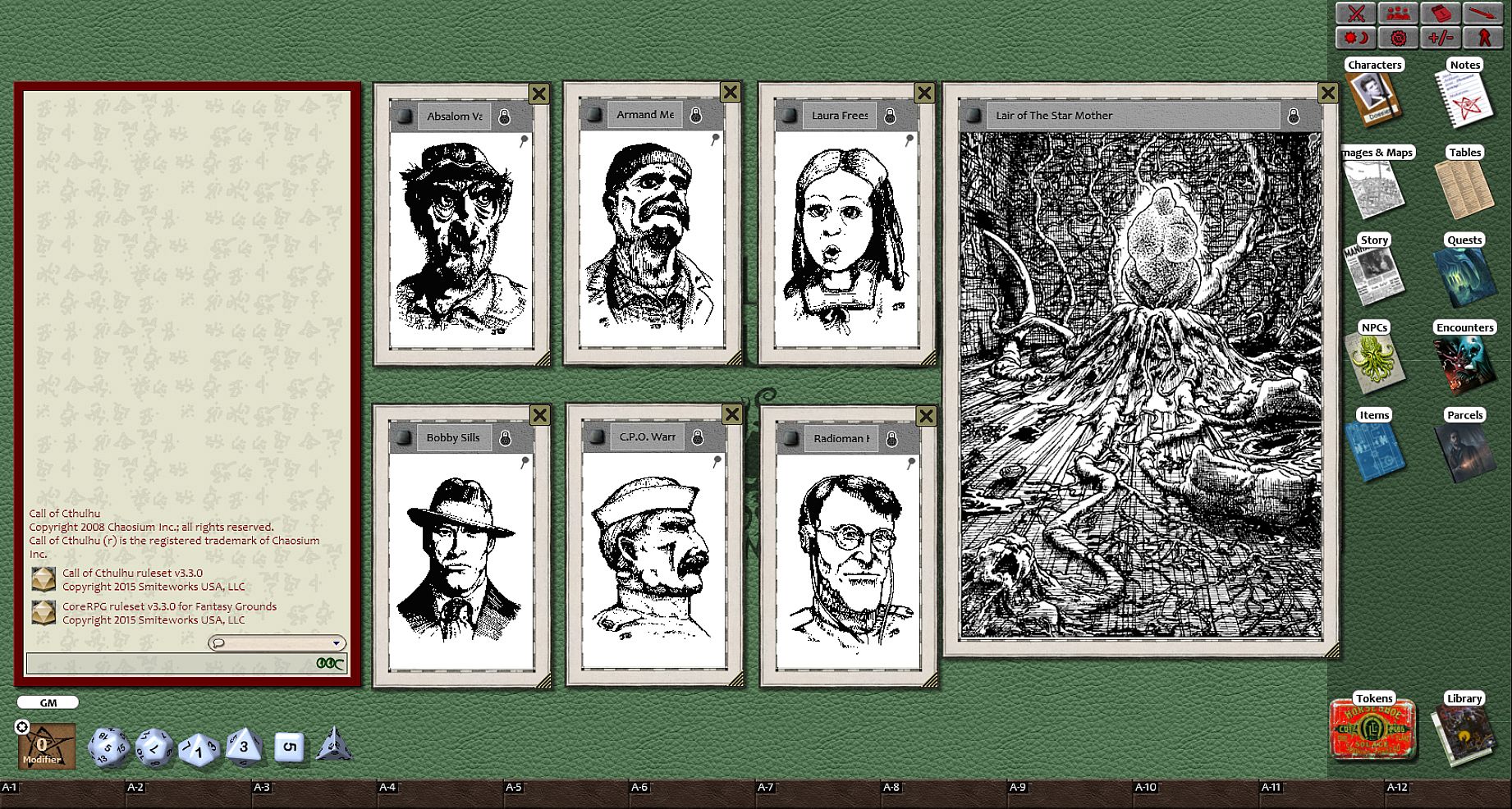 Requirements: An active subscription or a one time purchase of a Fantasy Grounds Full or Ultimate License and a one time purchase of the Call of Cthulhu ruleset.