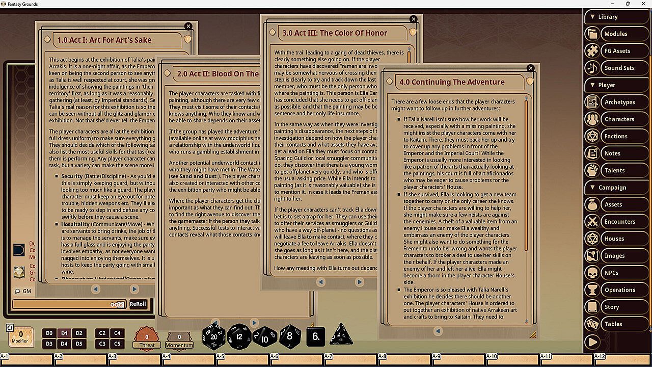 One of the Emperor's most favored artists has come to Arrakeen to exhibit works portraying the harsh beauty of Arrakis and the lives of its people. The player characters' House has been granted the responsibility of organising the exhibition. It should be a simple task to stage such a modest-yet-prestigious occasion. But of course, things do not go to plan. Investigating a problem with one of the paintings leads the player characters to pursue criminal elements and uncover evidence that something much bigger is afoot. Once revealed, it could threaten their lives, the standing of their House, and even the future of Arrakis. Ultimately, the player characters will face difficult decisions and dangerous people who may become allies or enemies depending on the players' choices.