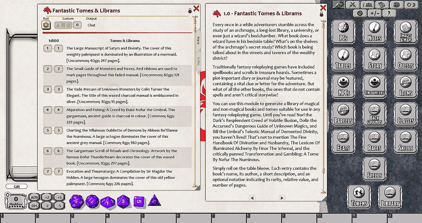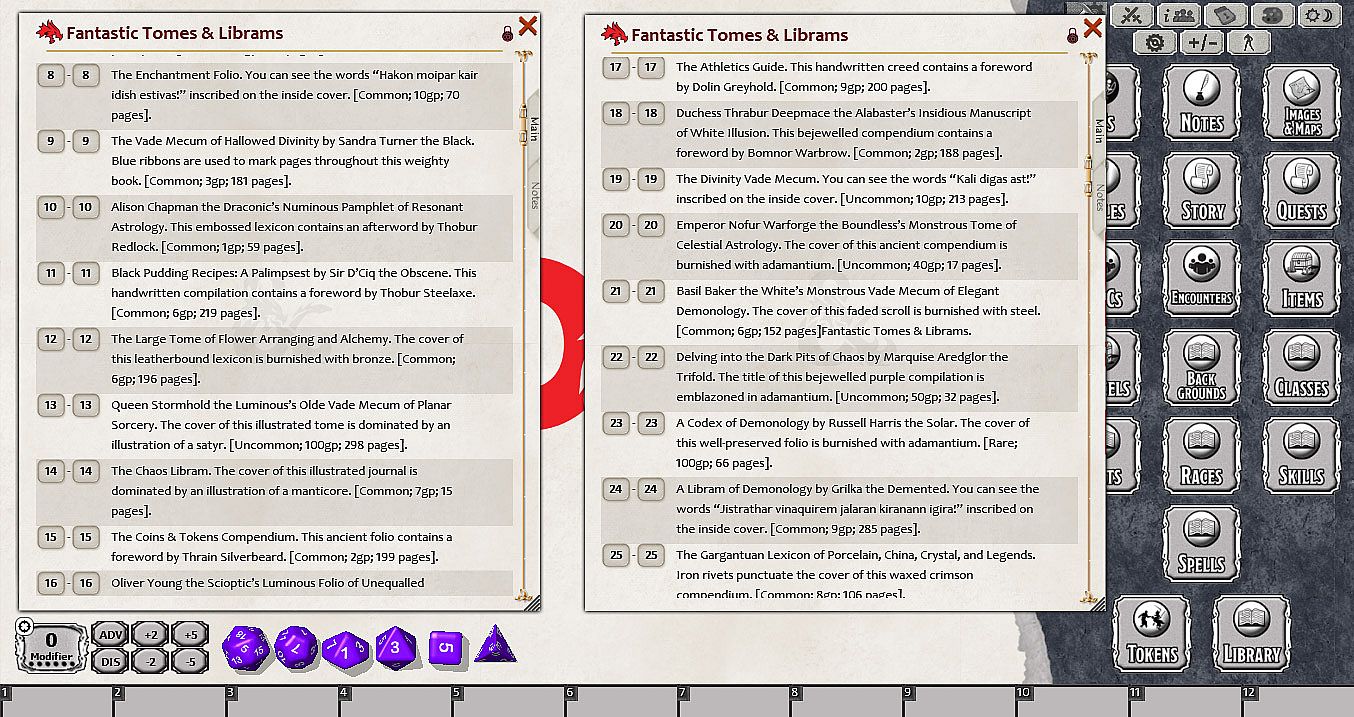 Fantastic Tomes & Librams presents you with 1d100 mundane but exotic books and tomes to furnish a wizard's study, a library, or a treasure hoard. Each entry contains the book's name, its author, a short description, and an optional notation indicating its rarity, relative value, and number of pages.