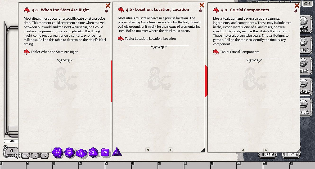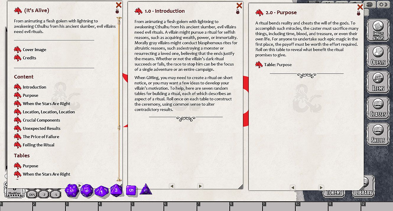 Does your victim wish to inflict a plague via an obscure ritual at the start of a solar eclipse on the grounds of an accursed cemetary using the blood of an innocent demon? Build rituals to achieve your villain's dark goals. Animate a golem, summon a god, open the Gates of Hell, or banish the sun.