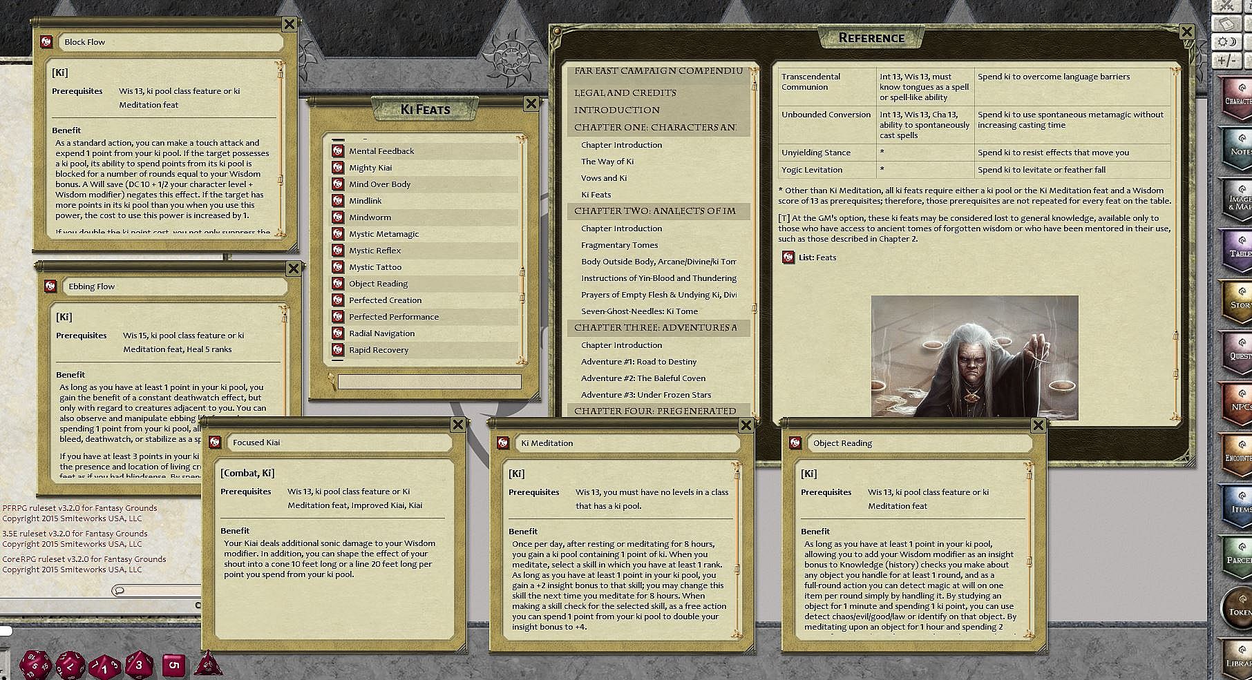 The Way of Ki. The power of ki lies latent within all things, flowing through mind, body, and spirit alike and able to be seen and harnessed by those with the focus, devotion, and dedication to master themselves and achieve perfect unity and balance. The game describes ki only in terms of the mystic powers manifested by the monk and ninja, and The Way of Ki contains a wealth of options for increasing the variety and flavor of what these classes can do through their mastery of meditative practice and transcendental contemplation. The power of ki, however, is universal, available to anyone with the focus, desire, and discipline to master it, and The Way of Ki allows characters of every class to unleash this power, adding it to or infusing it within their normal class abilities. Unlock the great mysteries and transcend the natural into the sublime. The game touches on these secrets only briefly, in the context of the mystic powers manifested by the monk and ninja. If ki truly represents the extension of the self into communion with the universe and its hidden flows, however, its secrets should be possible for anyone to master with the proper instruction and dedication. By exploring The Way of Ki, now they can!
