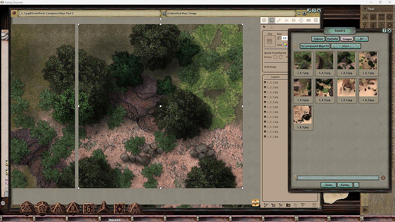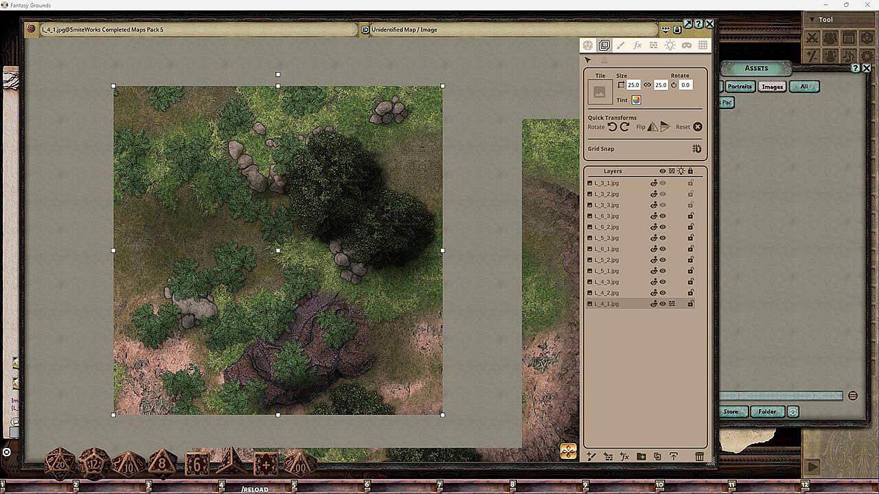 The Completed Maps Pack 5 features images and art produced by our in-house artist, Joshua Watmough. They have been organized and optimized for use with Fantasy Grounds Unity and the image tools. This map pack consists of 9 completed 25x25 maps that can be used on their own or combined to create a single massive seamless map and an even larger seamless map when combined with other Completed Maps Packs. This pack includes 9 maps of various locations including: