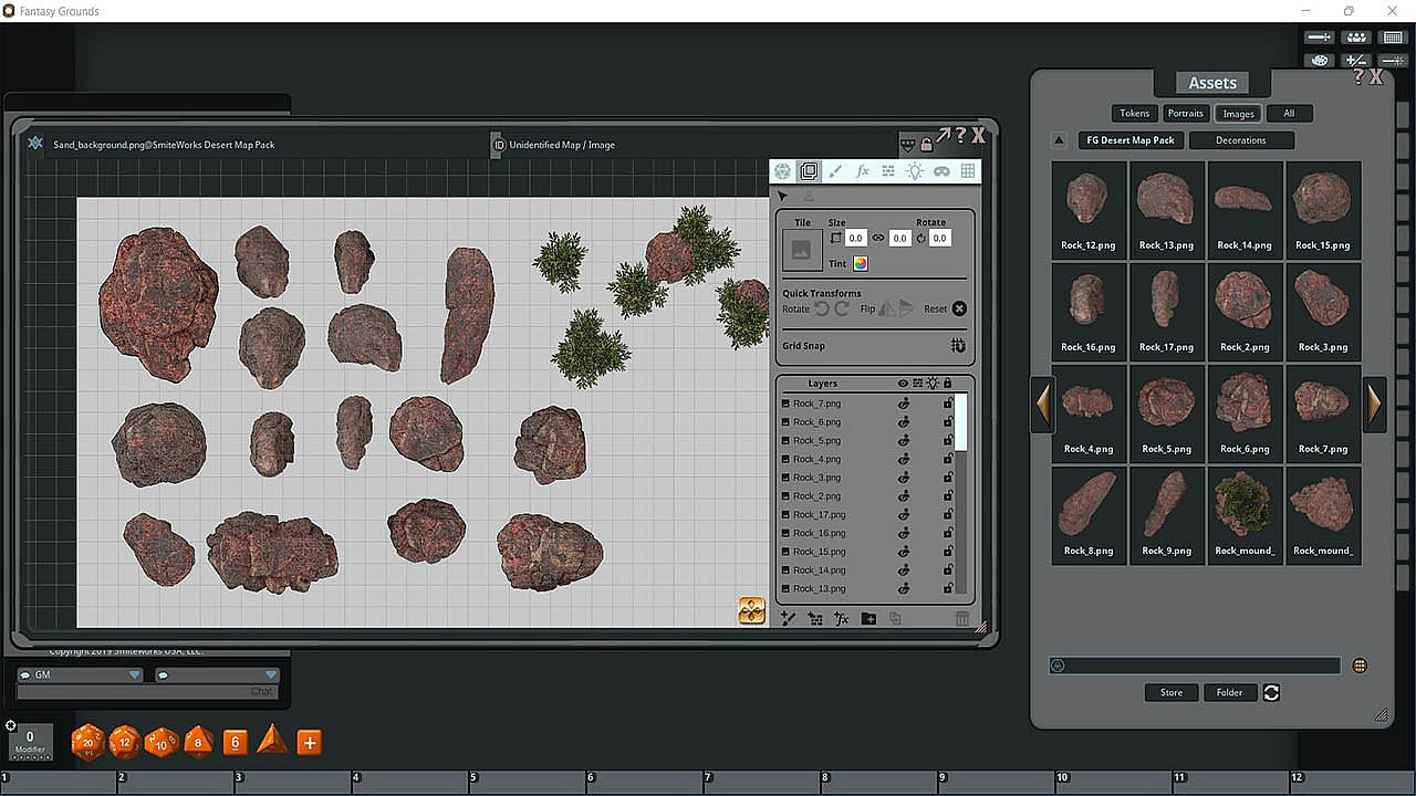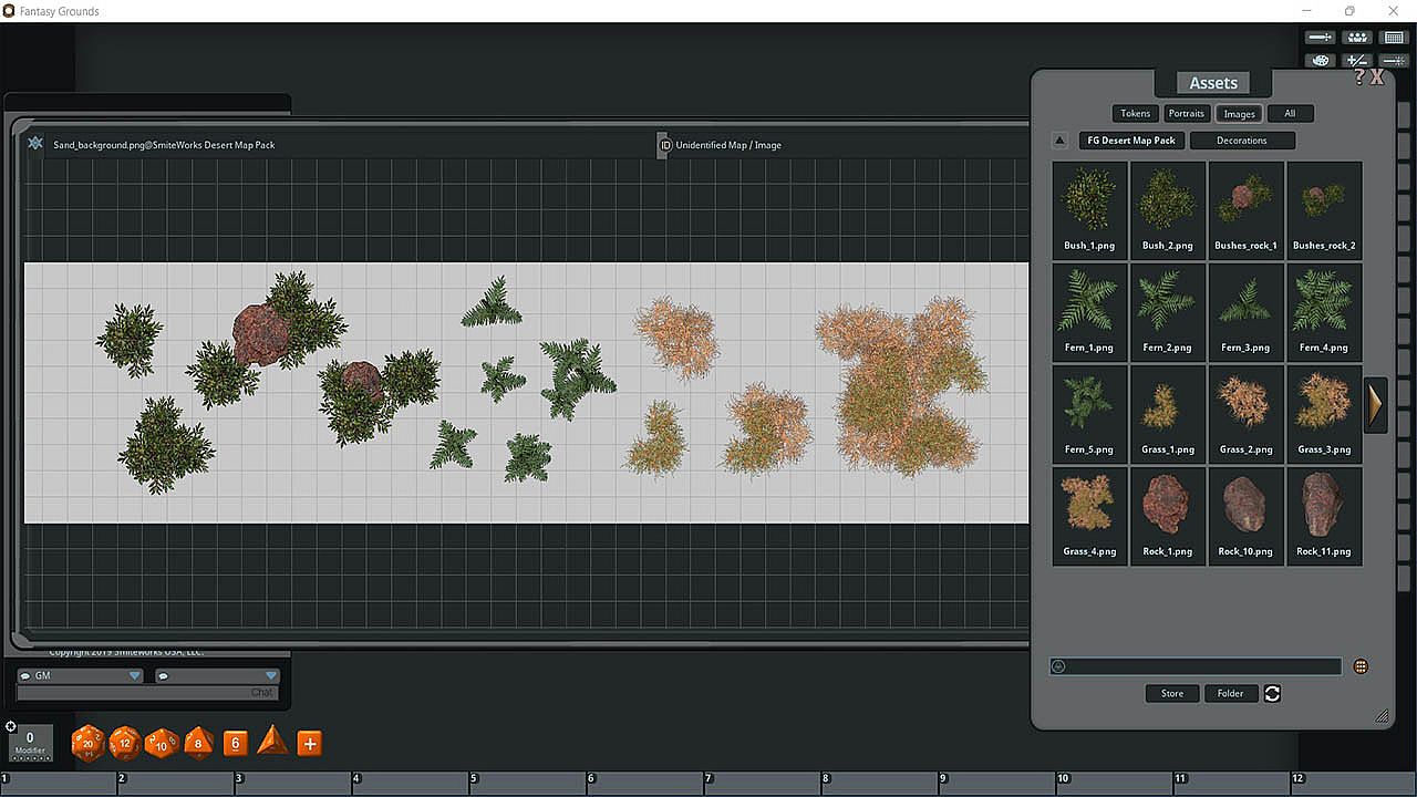 The Desert Map Pack features images and art produced by our in-house artist, Joshua Watmough. They have been organized and optimized for use with Fantasy Grounds Unity and the image tools. This art package allows the creation of desert and arid locations and consists of a solid base of natural elements and backgrounds.