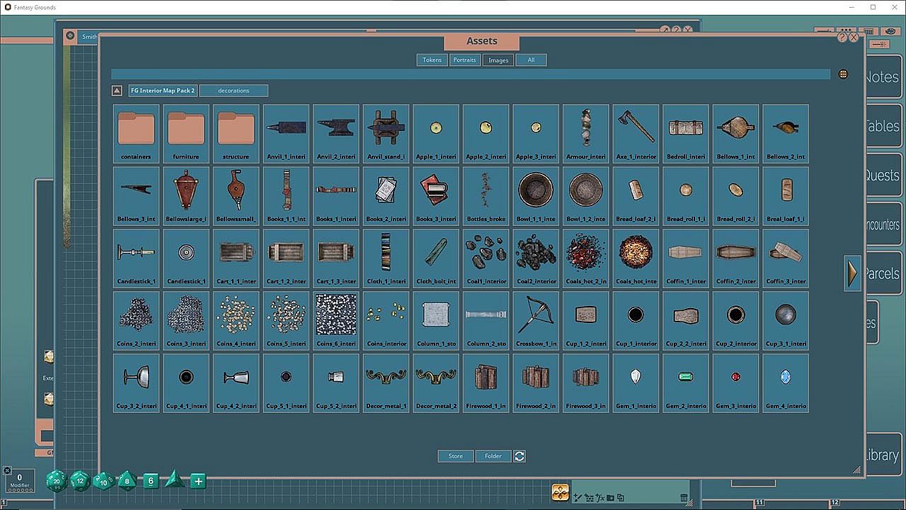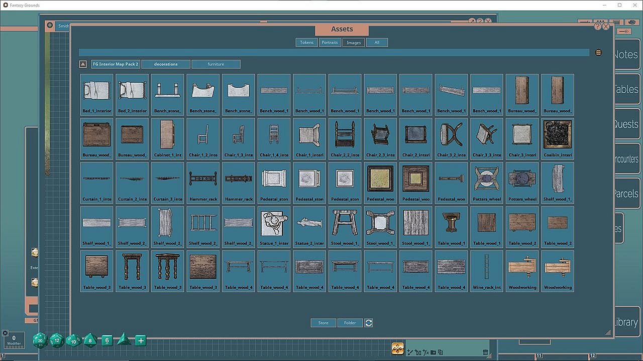 The Interior Map Pack 2 features images and art produced by our in-house artist, Joshua Watmough. They have been organized and optimized for use with Fantasy Grounds Unity and the new image tools. This map package is specifically designed to create additional interior locations such as artisan's work locations, treasure troves, taverns and more.