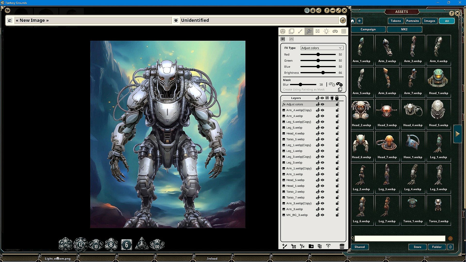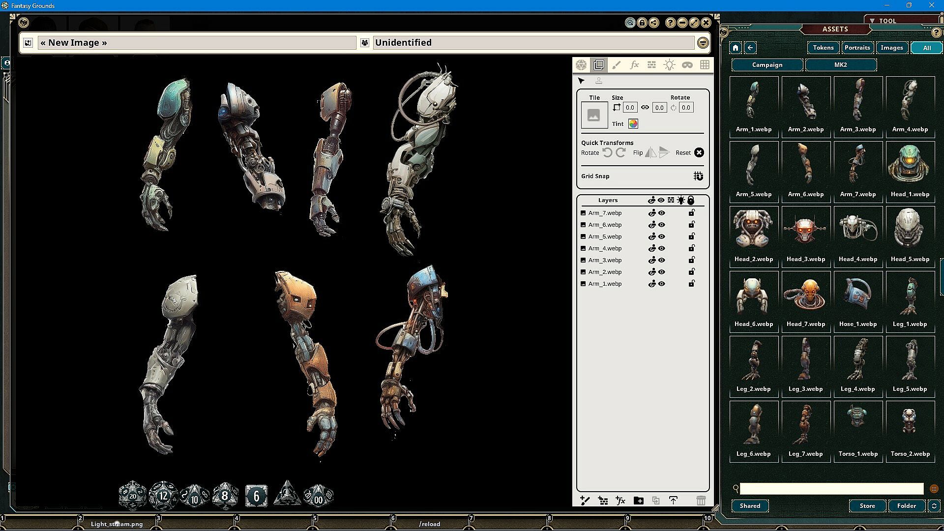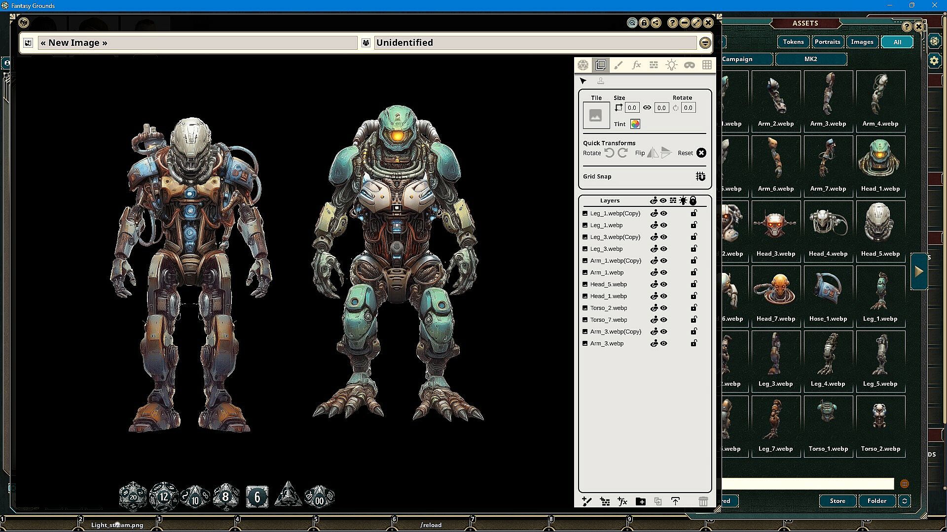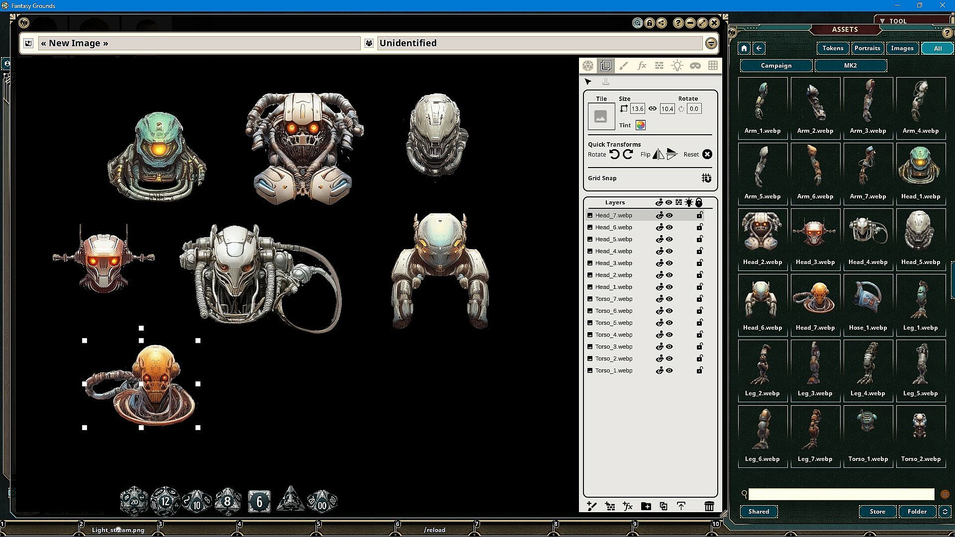 The Monster Kit Robots Art Pack features images and art produced by our in-house artist, Joshua Watmough. They have been organized and optimized for use with Fantasy Grounds Unity and the image tools. This art pack consists of images that can be used to create humanoid robots and cyborg monsters in a paper doll-style process. You can build unique creations by combining heads, torsos, arms, legs, and more. This pack includes the following items: