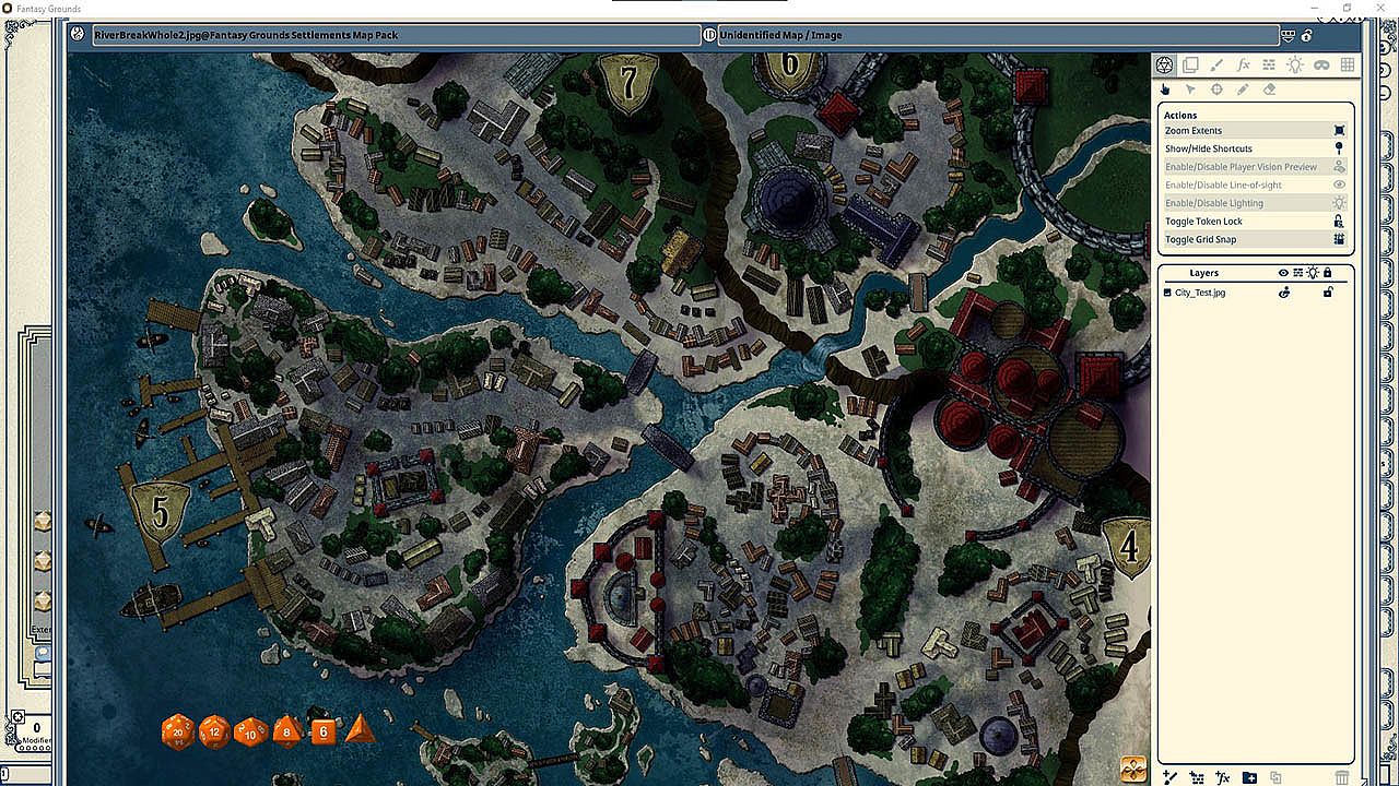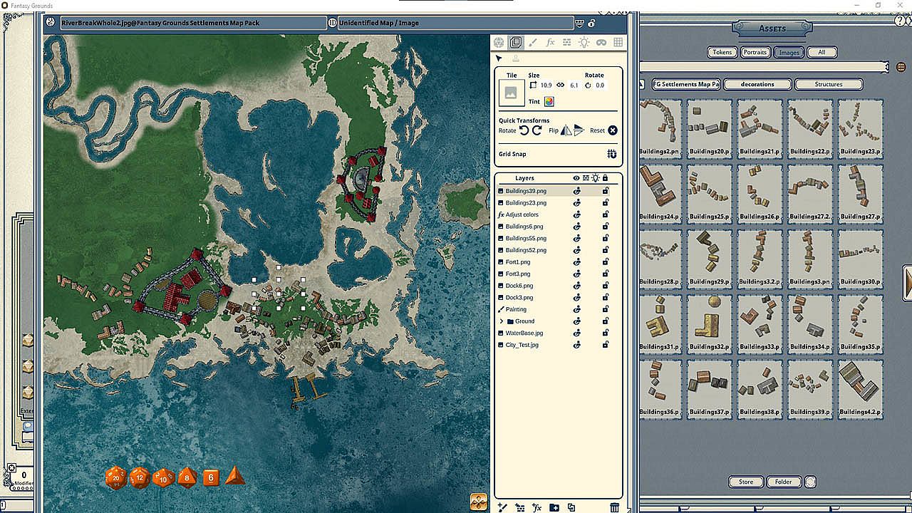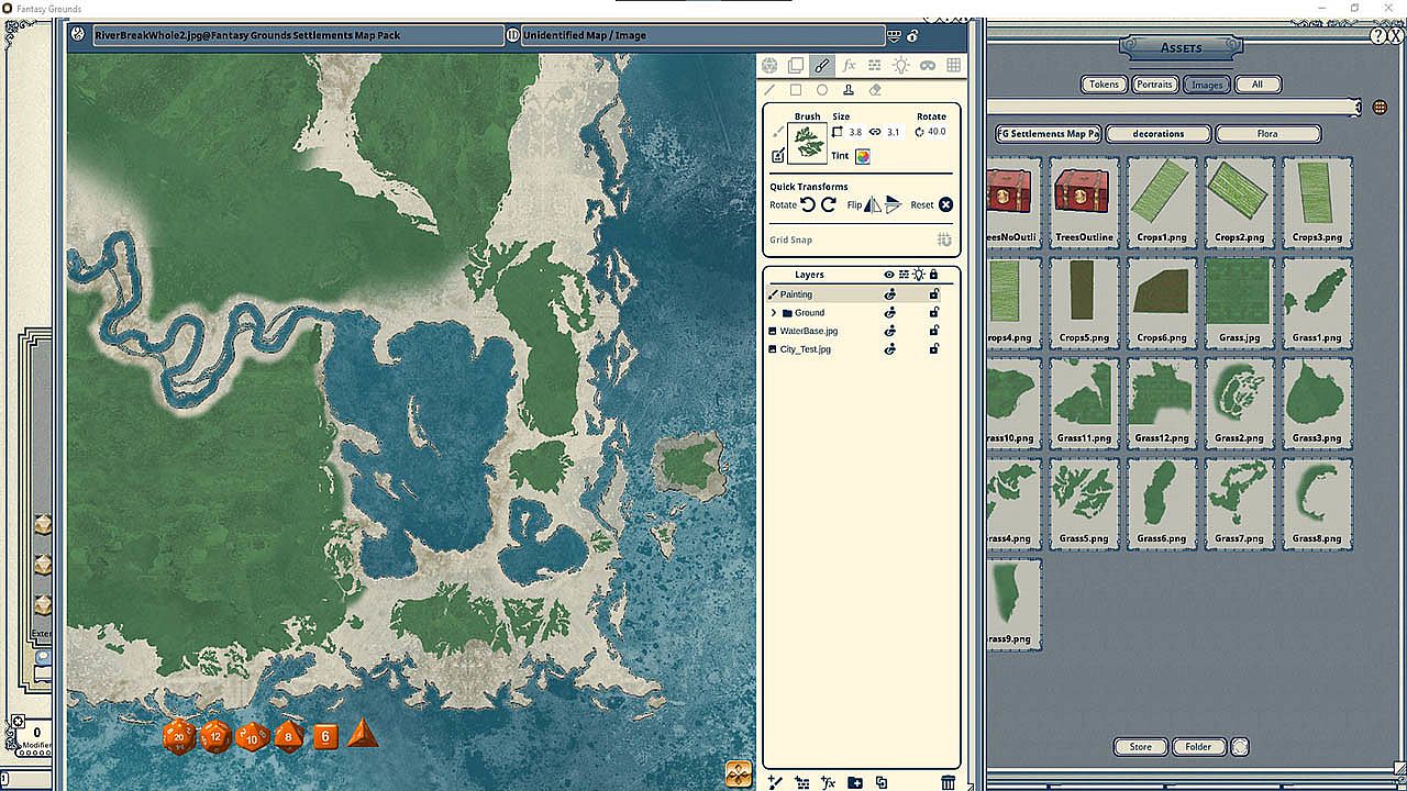 The Fantasy Grounds Settlement Map Pack features hand-drawn images and art produced by our in-house artist, Joshua Watmough. They have been organized and optimized for use with Fantasy Grounds Unity and the new image tools.This map package is specifically designed to create larger scale settlement locations of cities and fortifications as well as the surrounding terrain, water and waterways, and foliage.
