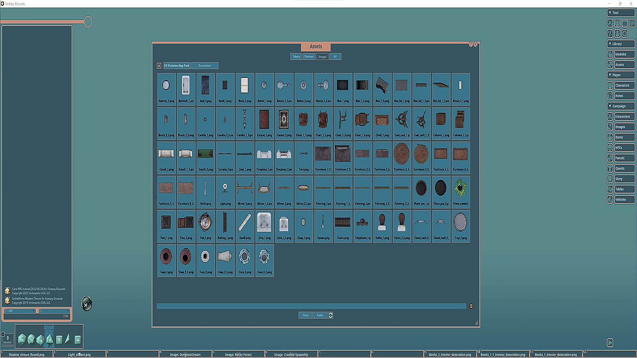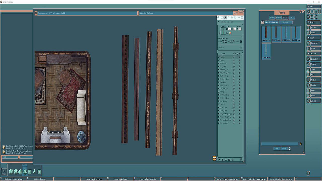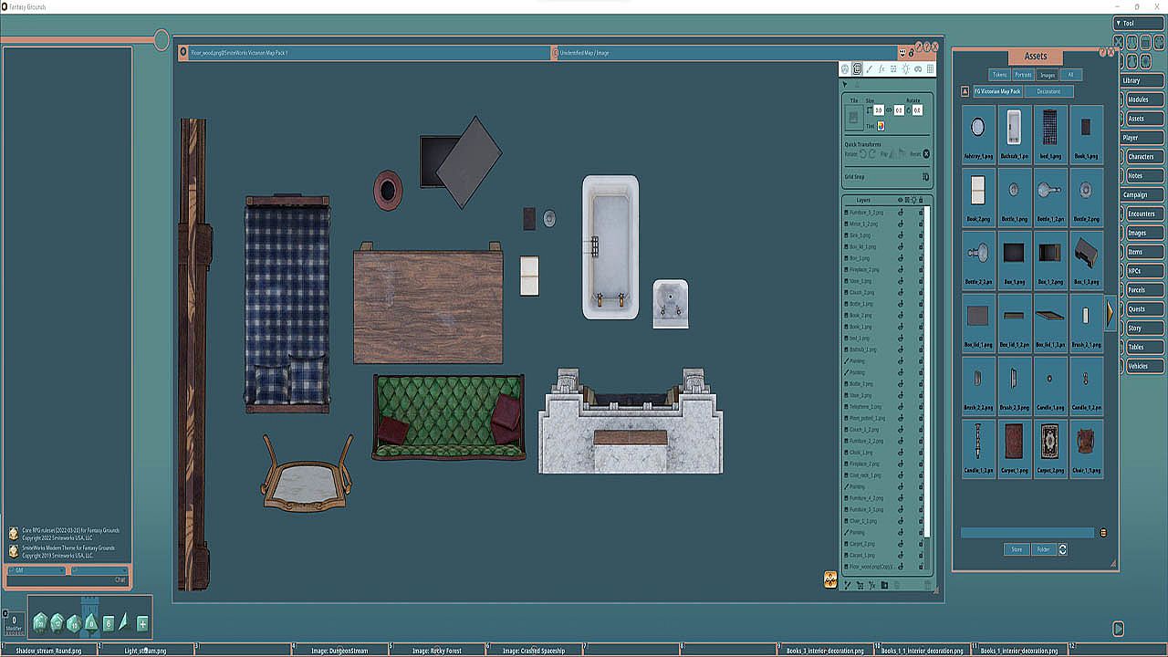 The Victorian Map Pack 1 features images and art produced by our in-house artist, Joshua Watmough. They have been organized and optimized for use with Fantasy Grounds Unity and the image tools. This art package allows the creation of typical dwellings of the Victorian era.This pack includes nearly 100 images of the following items: