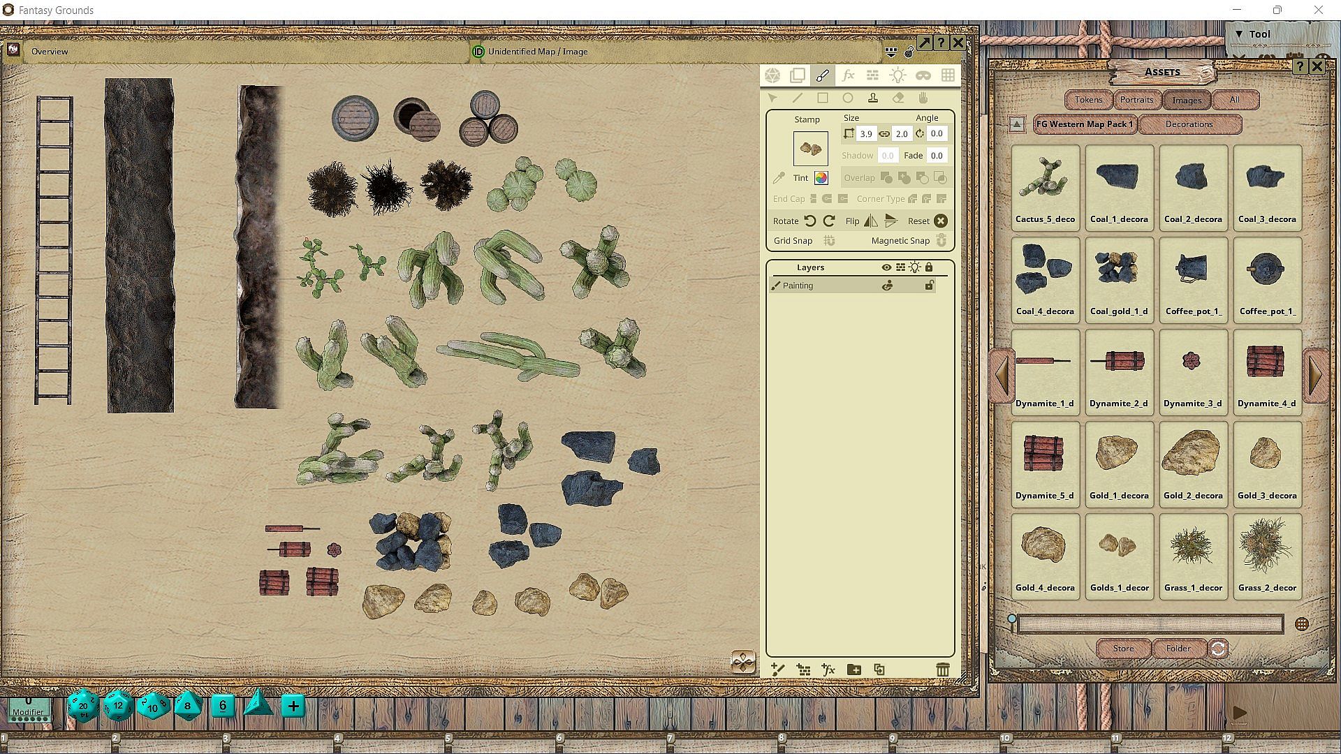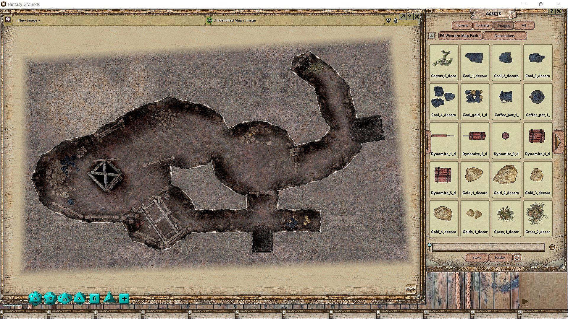The Western Map Pack features images and art produced by our in-house artist, Joshua Watmough. They have been organized and optimized for use with Fantasy Grounds Unity and the image tools. This art package allows the creation of classic outdoor western locations and mines and caves with over 100 images.