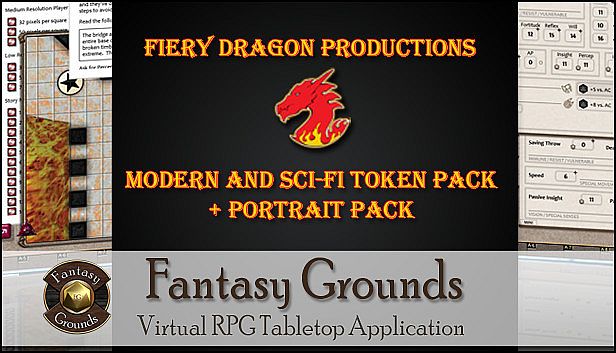 Fiery Dragon ProductionsThis product contains over 550 tokens in a base 70 pixel format (for Medium-sized) and over 250 portraits, all converted and optimized for online gaming over Fantasy Grounds. Produced by artist Claudio Pozas and Fiery Dragon Productions, these tokens are framed in a fiery border. The tokens are sorted into a token module for sci-fi and one for modern tokens. The portraits are provided in separate PPK files, separated for Sci-Fi and Modern.