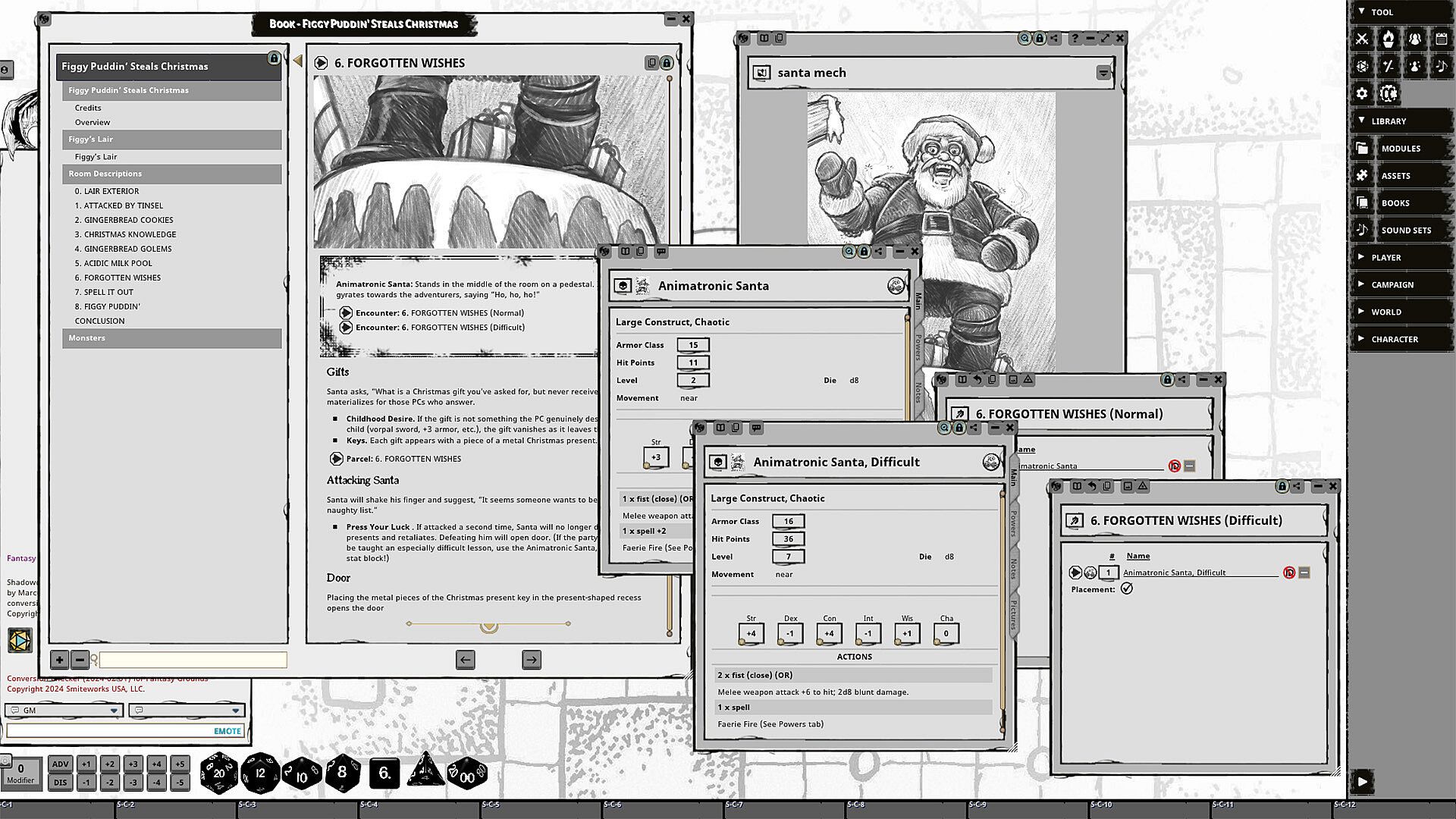 After you introduce the hook, the adventure occurs in Figgy Puddin's lair - a refurbished kobold bunker consisting of eight rooms. As the characters explore the linear dungeon, they encounter new creatures, complete challenges, and are tested about their Christmas knowledge. However, the final confrontation with the naughty Figgy Puddin' could make for a very Unhappy and Unmerry Christmas for our heroes, the children of Thistleton, and their parents.