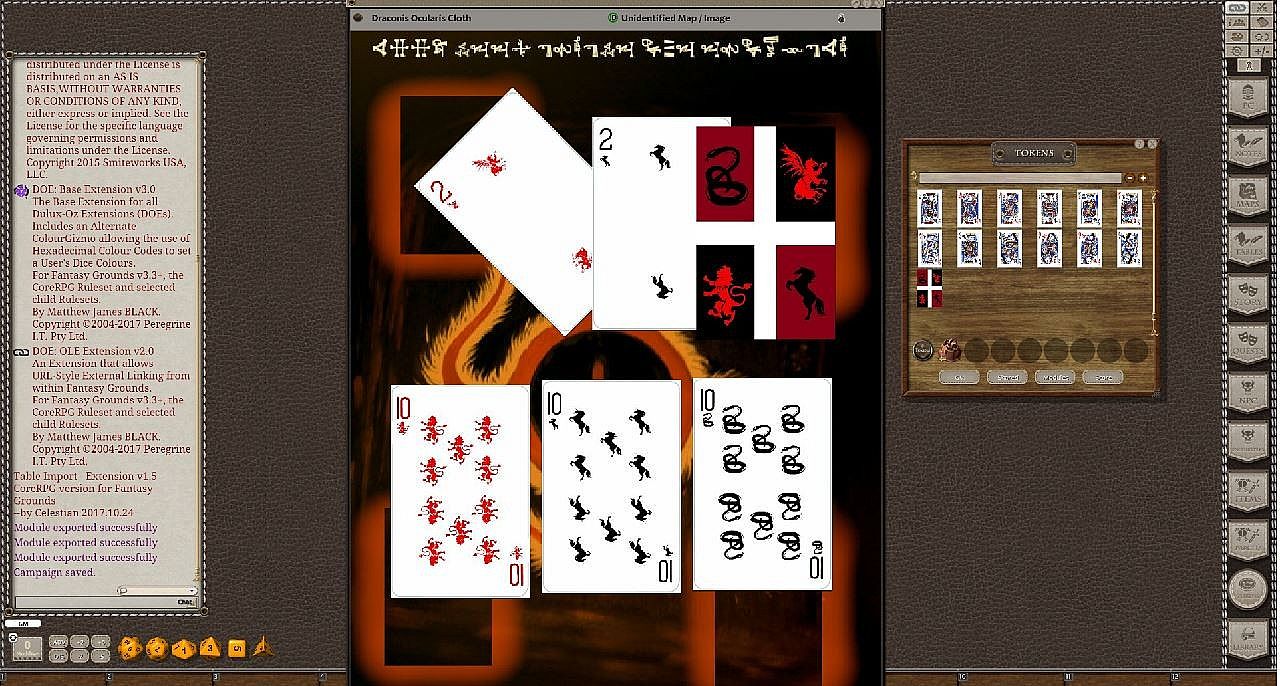 Snazz up your Tavern, Inn or Den of Iniquity with this special combo set of Gambling Tools and Tarot Cards. Featuring unique interactive games or instant outcome roller, visual graphics, handy tables for winnings/losses, gameplay summary, and the opportunity to completely wreck the bar. Introducing the unique 32 card (+1 rear) 'Draconis Ocularis' Tarot Set and the Modified 52 (+1 rear) Card Deck with new heraldic pips to give your games both that fantasy and that familiar feel. Supplied in full as images and tokens. Designed for 5E but generic enough to fit any RPG.