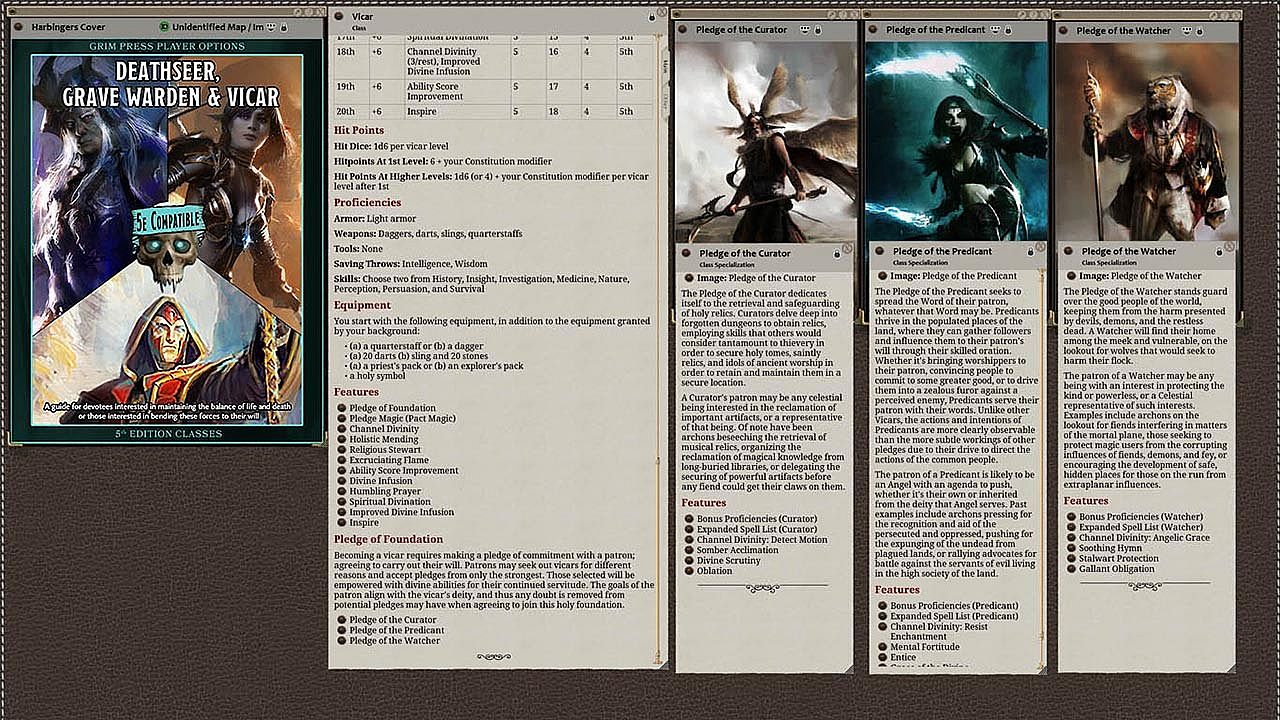 The Vicar is a pious pact magic divine casting class. Typically, high-ranking members of their clergy, vicars strive to fulfill a greater purpose. In their search, they are guided by their deity to pledge themselves into the service of a celestial being and are granted divine powers as a reward for this devotion. However, patrons don't accept a pledge from everyone who seeks to enter into their service, rather only those deemed capable of carrying out their duties are brought under their tutelage. The Vicar is a complete D&D 5e class with three fully detailed archetypes, called pledges of foundation, which will give players unique options when creating and playing their characters. The archetypes are: Pledge of the Curator, Pledge of the Predicant, and Pledge of the Watcher.
