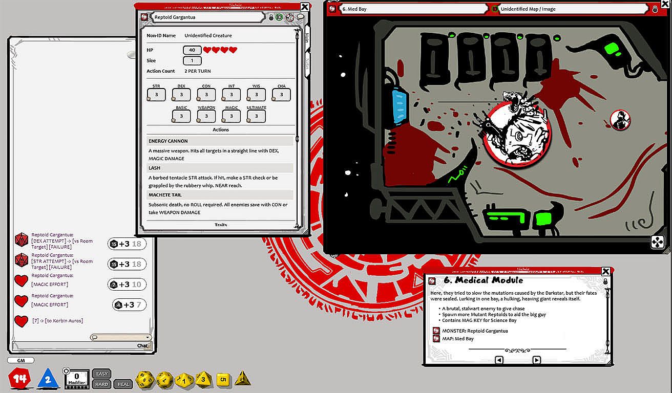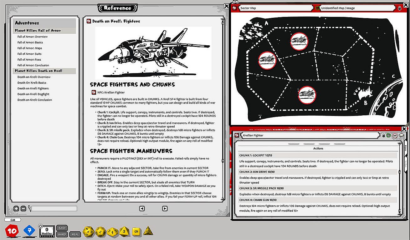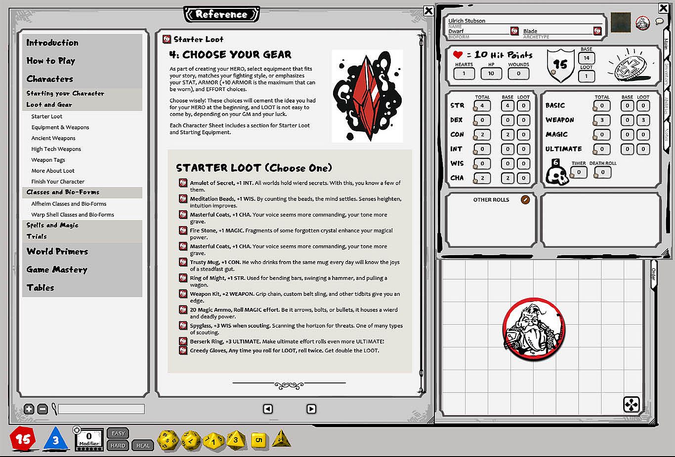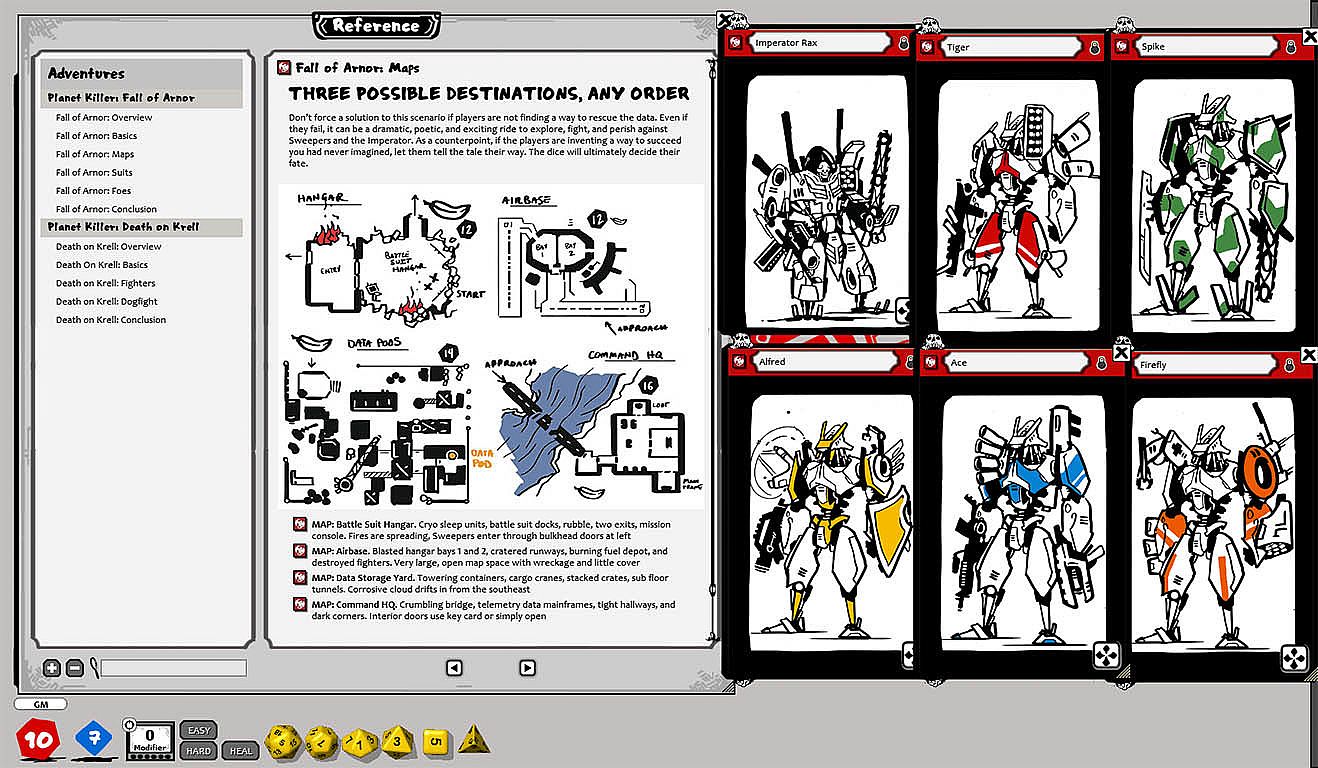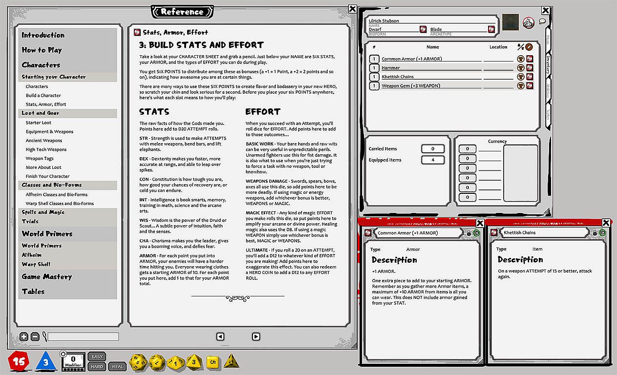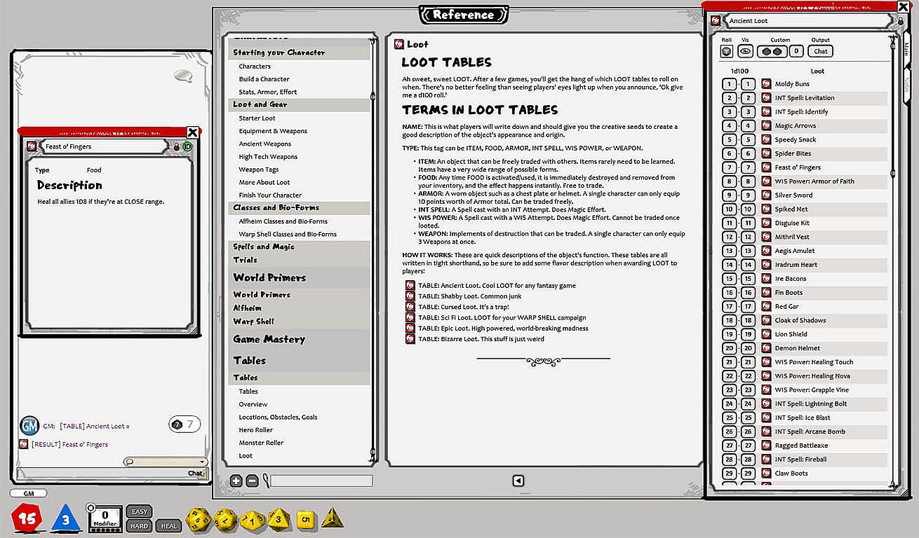 >> Classic 7 dice, D20 roll-over system, and all the combat and RP mechanics, character classes, timers, targets and elements you need to play right away. This system is fast and fun, but doesn't lose track of the best parts of tabletop dice rolling.
