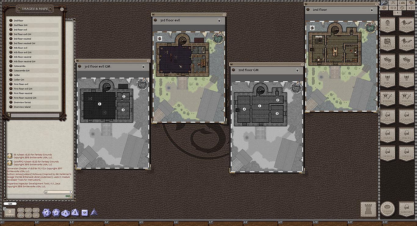 The tower has five floors and a catacomb level below. Three of the levels have two different versions neutral or evil.