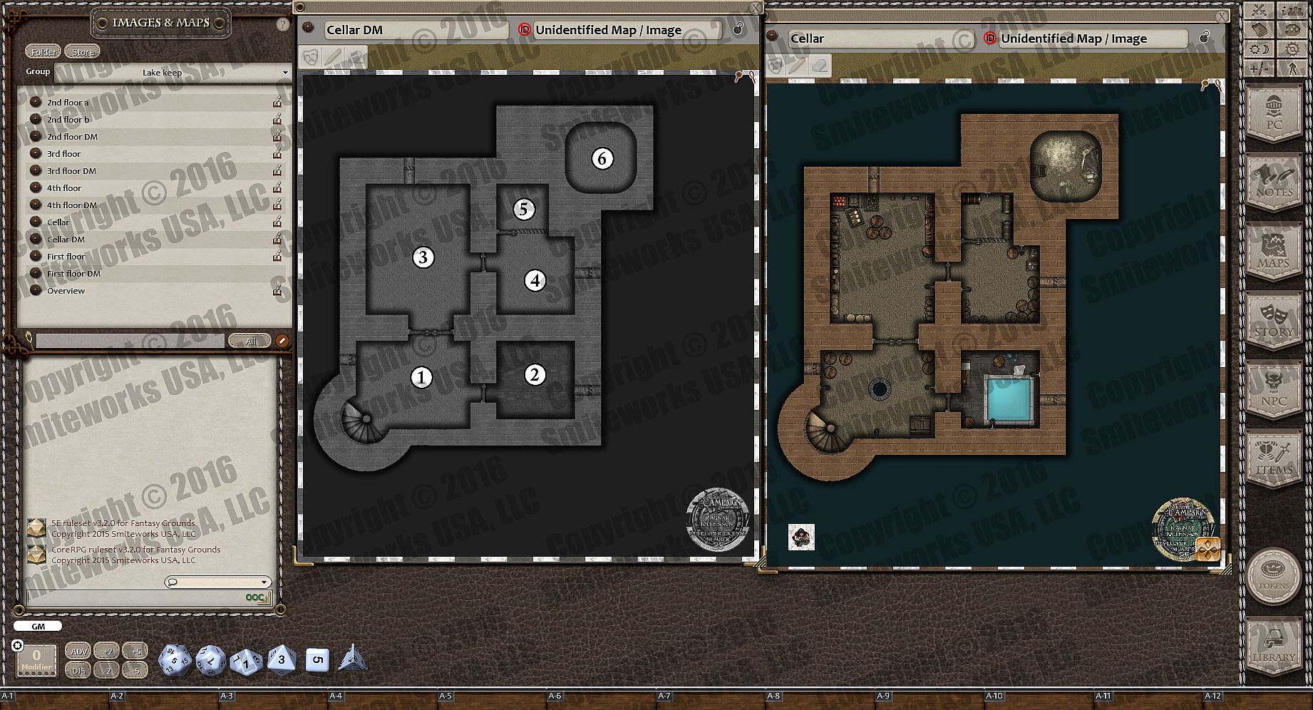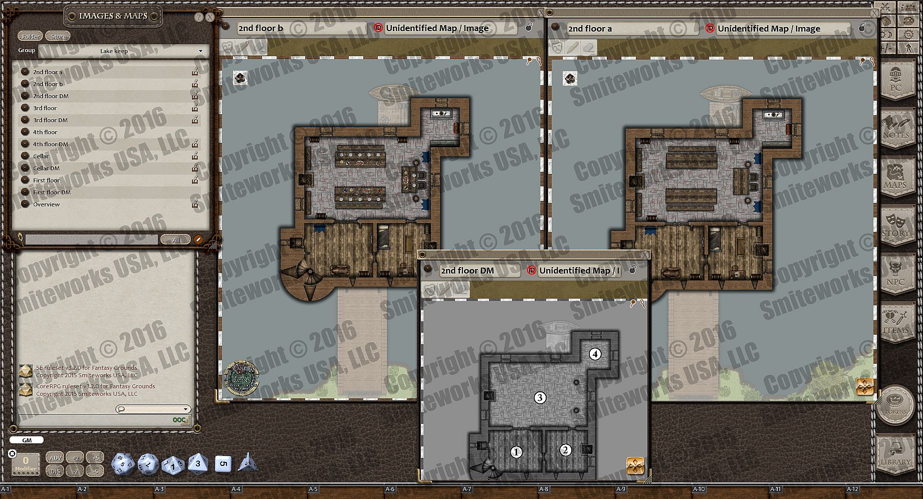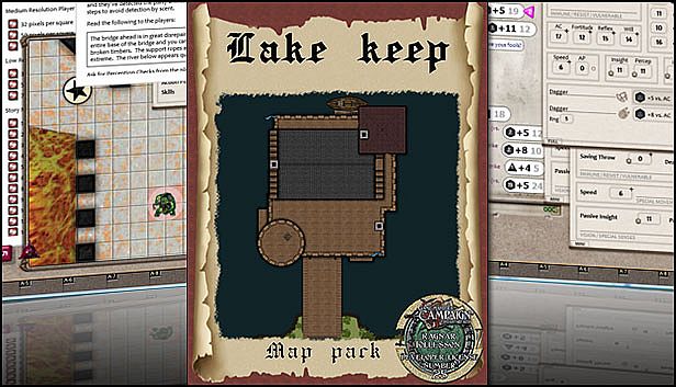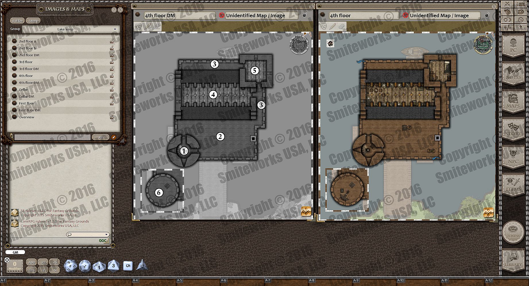 A small keep situated on a lake or a river. The keep consists of 4 floors and a cellar, all fully furnished. All maps have a corresponding DM map.