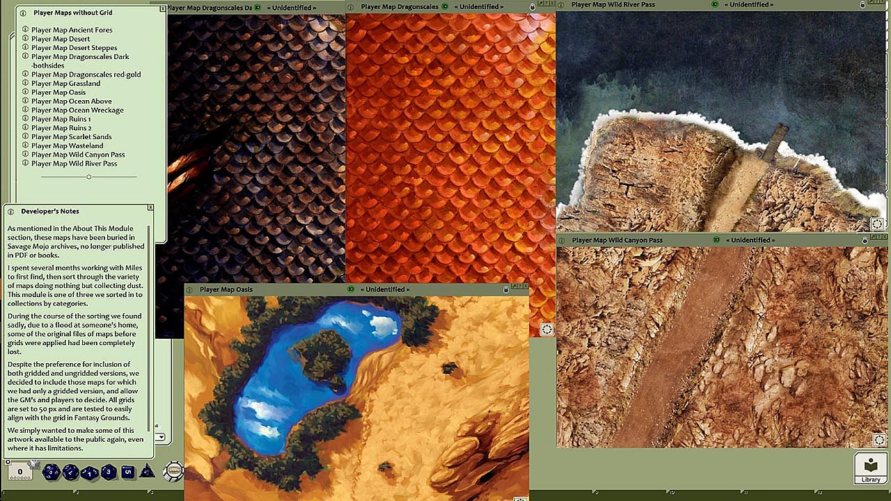 Savage Mojo has raided its vault for long lost treasures - a series of maps created by superstar artists such as Jason Engle and Aaron Acevedo. We've tidied and resized them for use with Fantasy Grounds so they can enhance your online gaming experience. Suitable for any rules system, we hope you enjoy this collection of encounter locations.