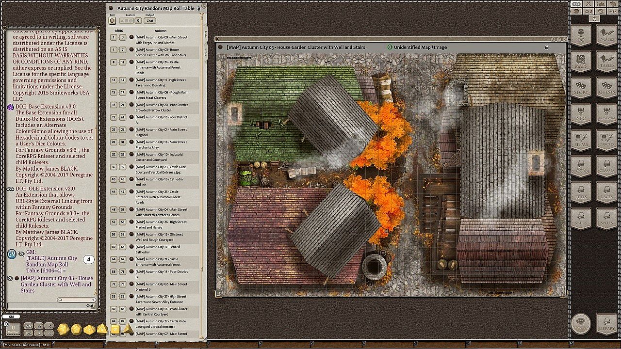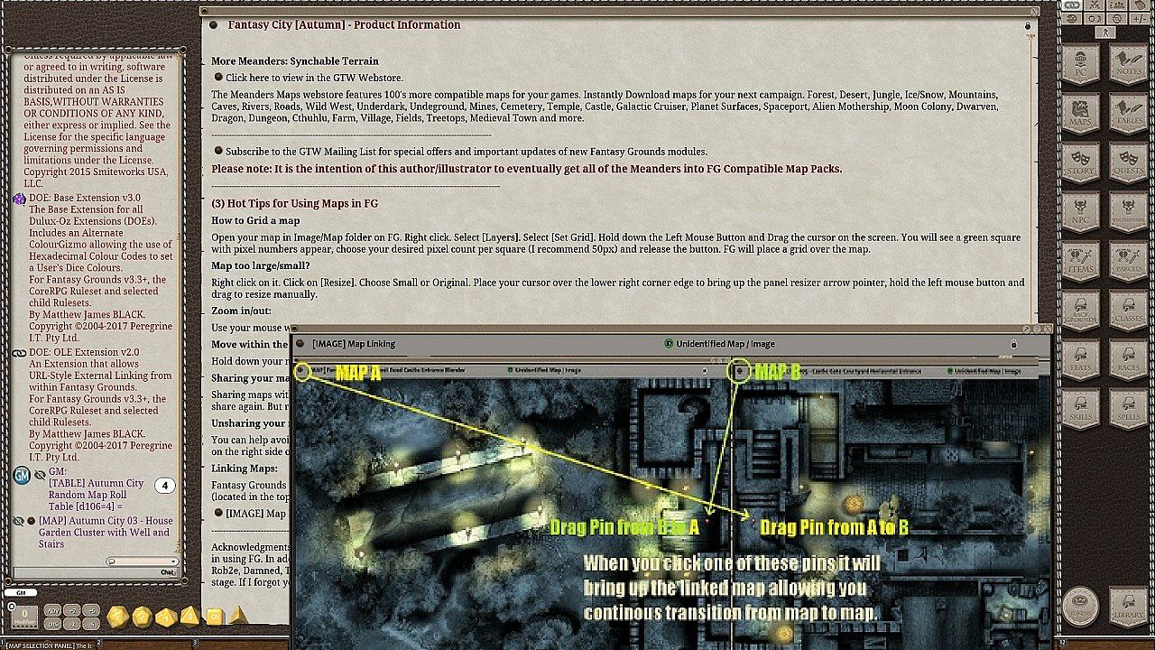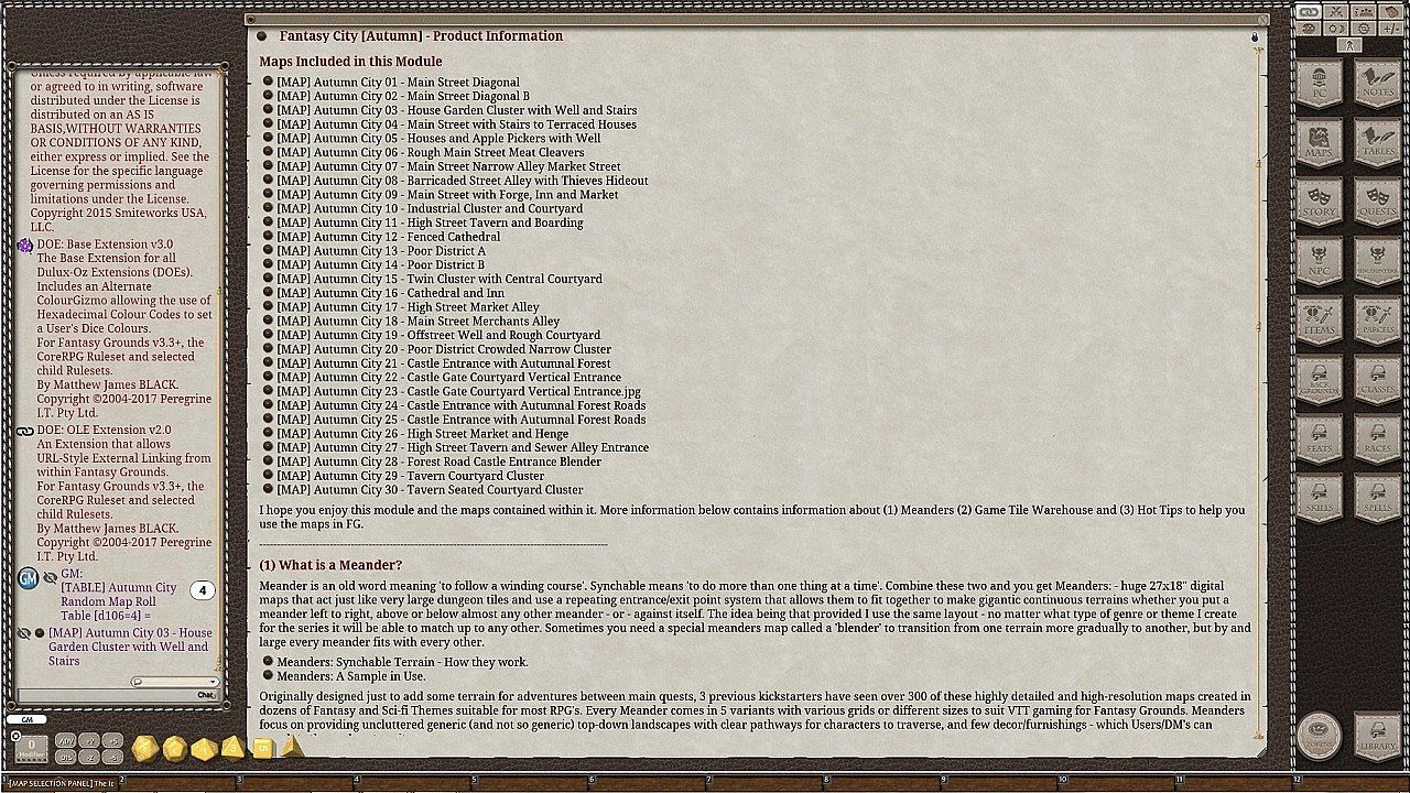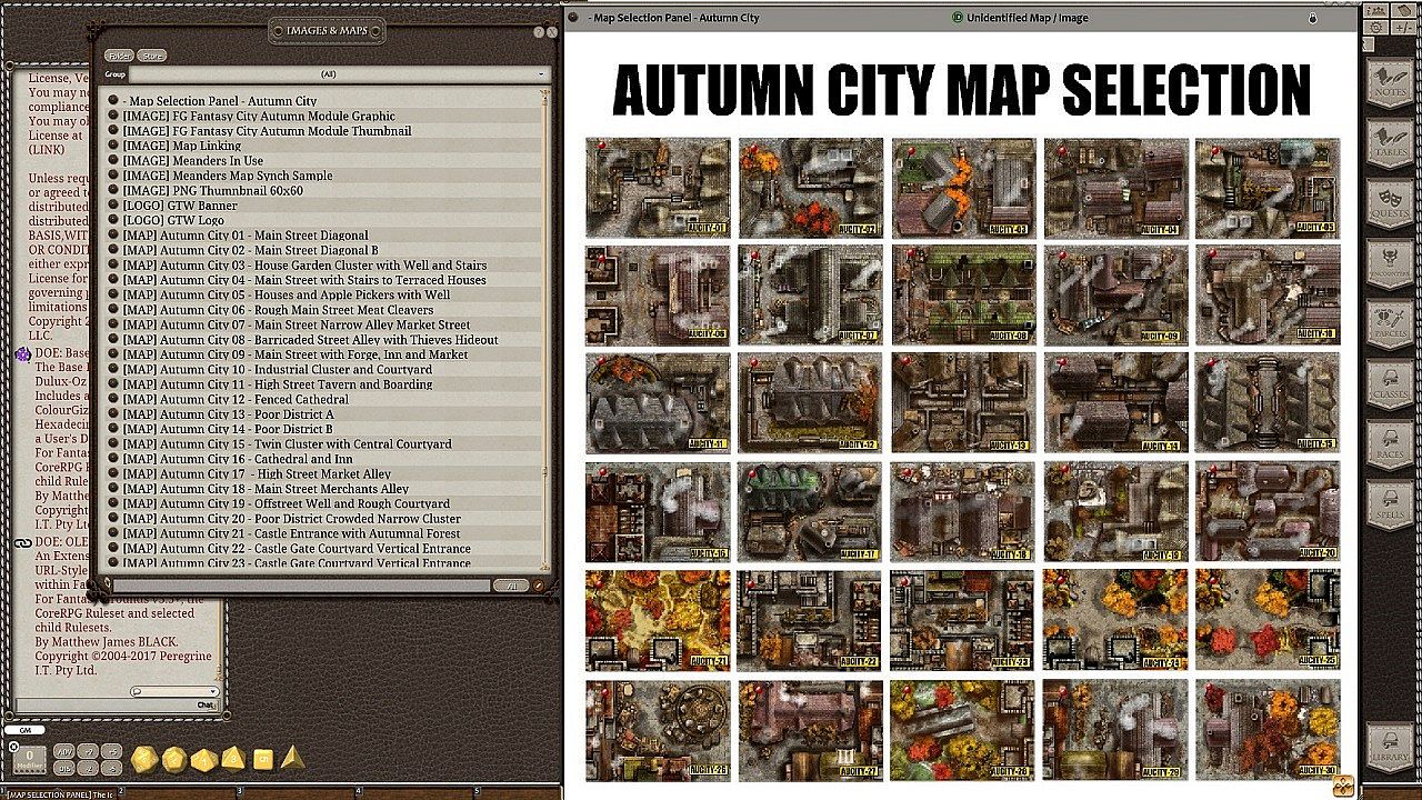 Maps are sized specially for FG at 1350x900 and under 500 kb each to help prevent slow-down during play. DM Convenience is the focus with carefully labelled maps and several ways to access, use and choose the maps in this module. Use the VISUAL MAP SELECTION PANEL and pick your map from the thumbnails and yellow label by clicking on the pin. Or use the RANDOM ROLL TABLES to pick your destination at random.