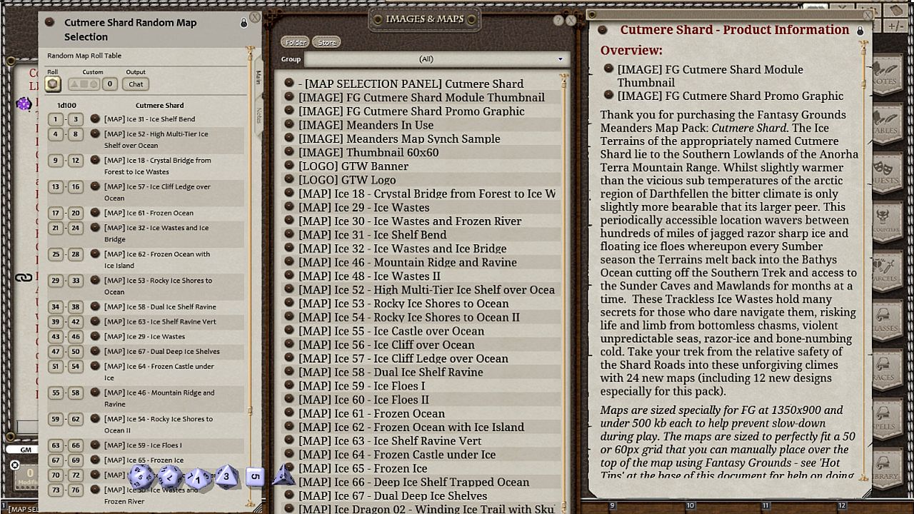 Maps are sized specially for FG at 1350x900 and under 500 kb each to help prevent slow-down during play. DM Convenience is the focus with carefully labelled maps and several ways to access, use and choose the maps in this module. Use the VISUAL MAP SELECTION PANEL and pick your map from the thumbnails and yellow label by clicking on the pin. Or use the RANDOM ROLL TABLE - a d100 table to pick your destination at random.