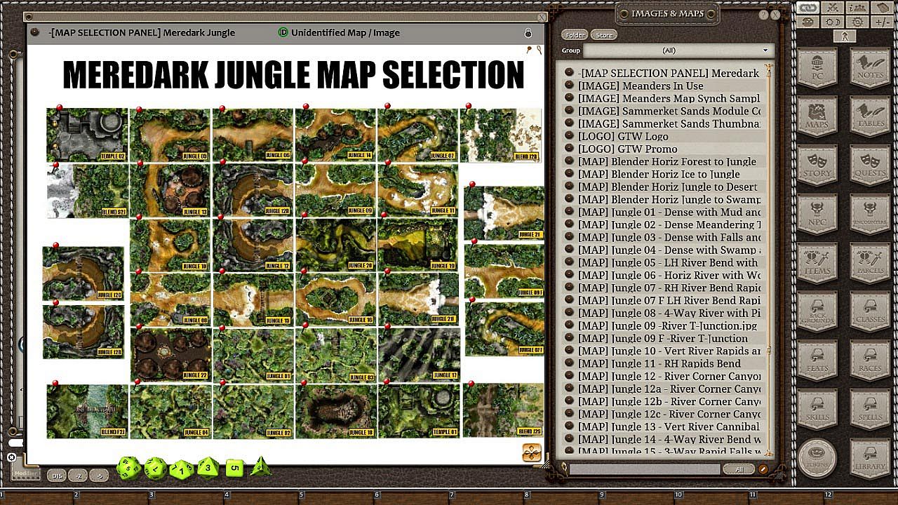 Thank you for purchasing the Fantasy Grounds Meanders Map Pack: Meredark Jungle. This pack contains 34 Jungle Themed maps sized specially for FG at 1350x900 and under 500 kb each to help prevent slow-down during play. The maps are sized to perfectly fit a 50 or 60px grid that you can manually place over the top of the map using Fantasy Grounds.