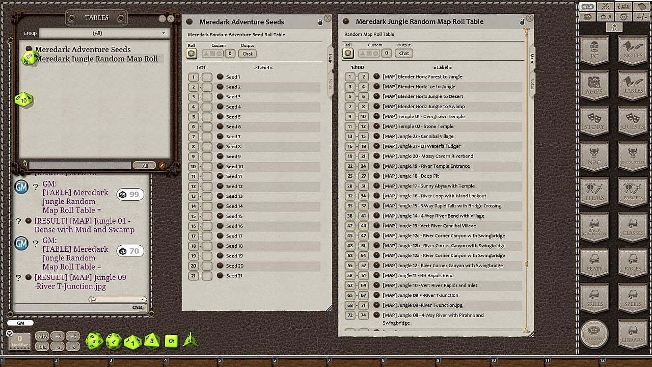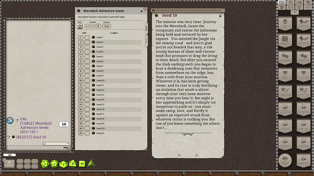 Join the maps in this module together with each other, with other modules in this series such as Venmire Woods, Shard Roads or Sammerket Sands , use a single map or use a combination of Time-lapse, Role-play and/or the supplied weighted Random Roll Table to determine when maps are used and where adventurers end up next. To use: Open the Table from the TABLES tab. Click on ROLL. When the result appears in the Chat Window click the link icon to bring up the rolled map. Or you can drag the following command into a Hot Key for easy access. Right Click on that Hot Key to change it's name to something more memorable. It also includes a roll table with 21 random adventure seeds.