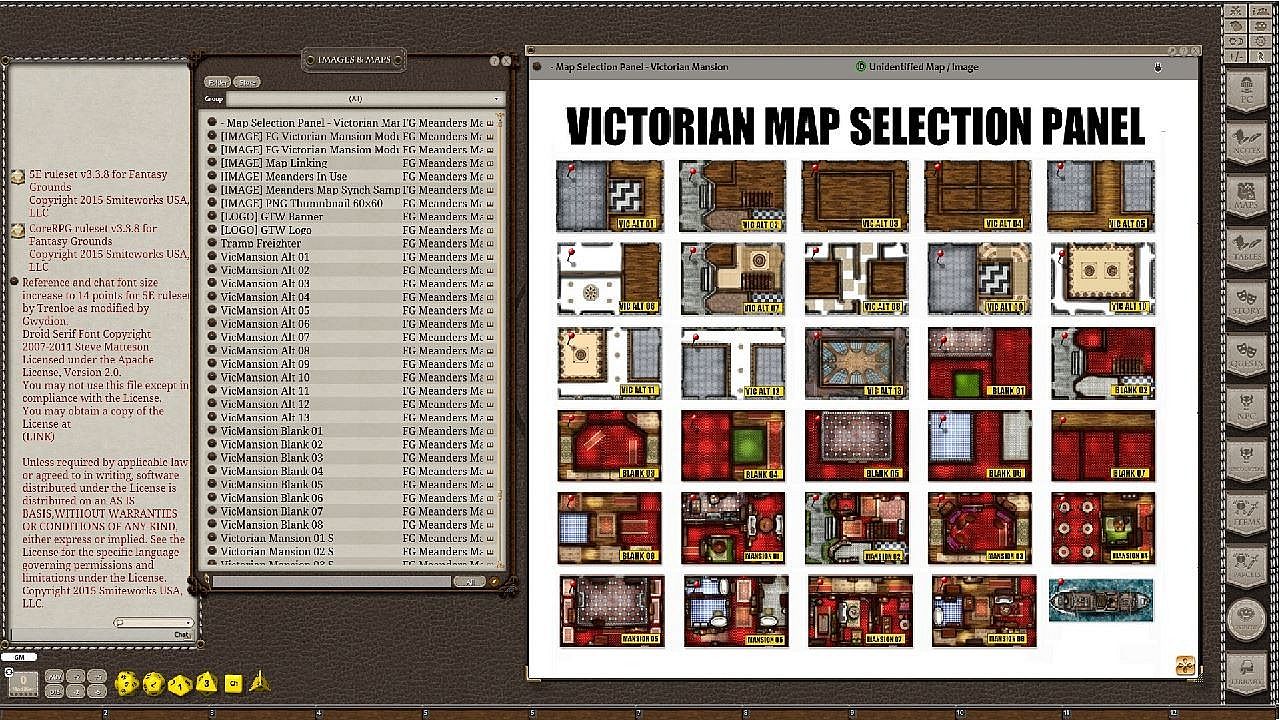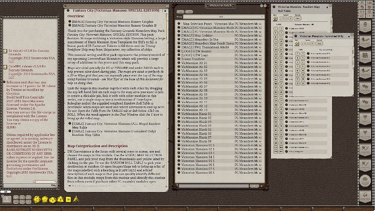 Maps are sized specially for FG at 1350x900 and under 500 kb each to help prevent slow-down during play. DM Convenience is the focus with carefully labelled maps and several ways to access, use and choose the maps in this module. Use the VISUAL MAP SELECTION PANEL and pick your map from the thumbnails and yellow label by clicking on the pin. Or use the RANDOM ROLL TABLES to pick your destination at random.