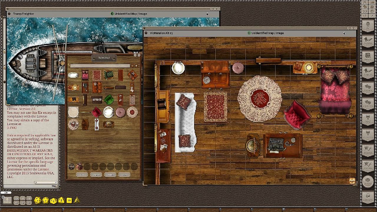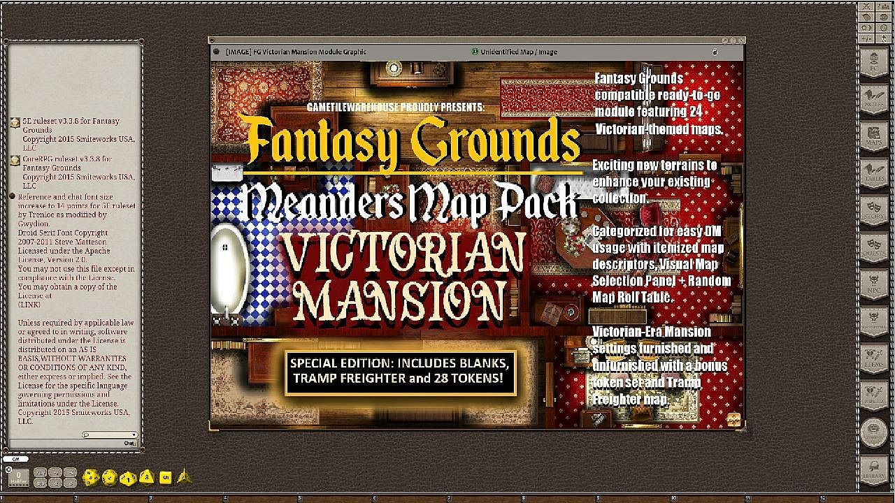 SPECIAL EDITION. This pack features 30 maps including a Victorian-style Mansion Setting, a large assortment of blank Mansion Area Templates for DM's to fill, a bonus pack of 28 Furniture Tokens to fill them and the Tramp Freighter Ship map from Shipstarter, my collection of ships. This unusual setting and first pack represents the primary tendril of my upcoming Lovecraftian Meanders which will provide a large array of additions to this genre and this map pack. It includes: