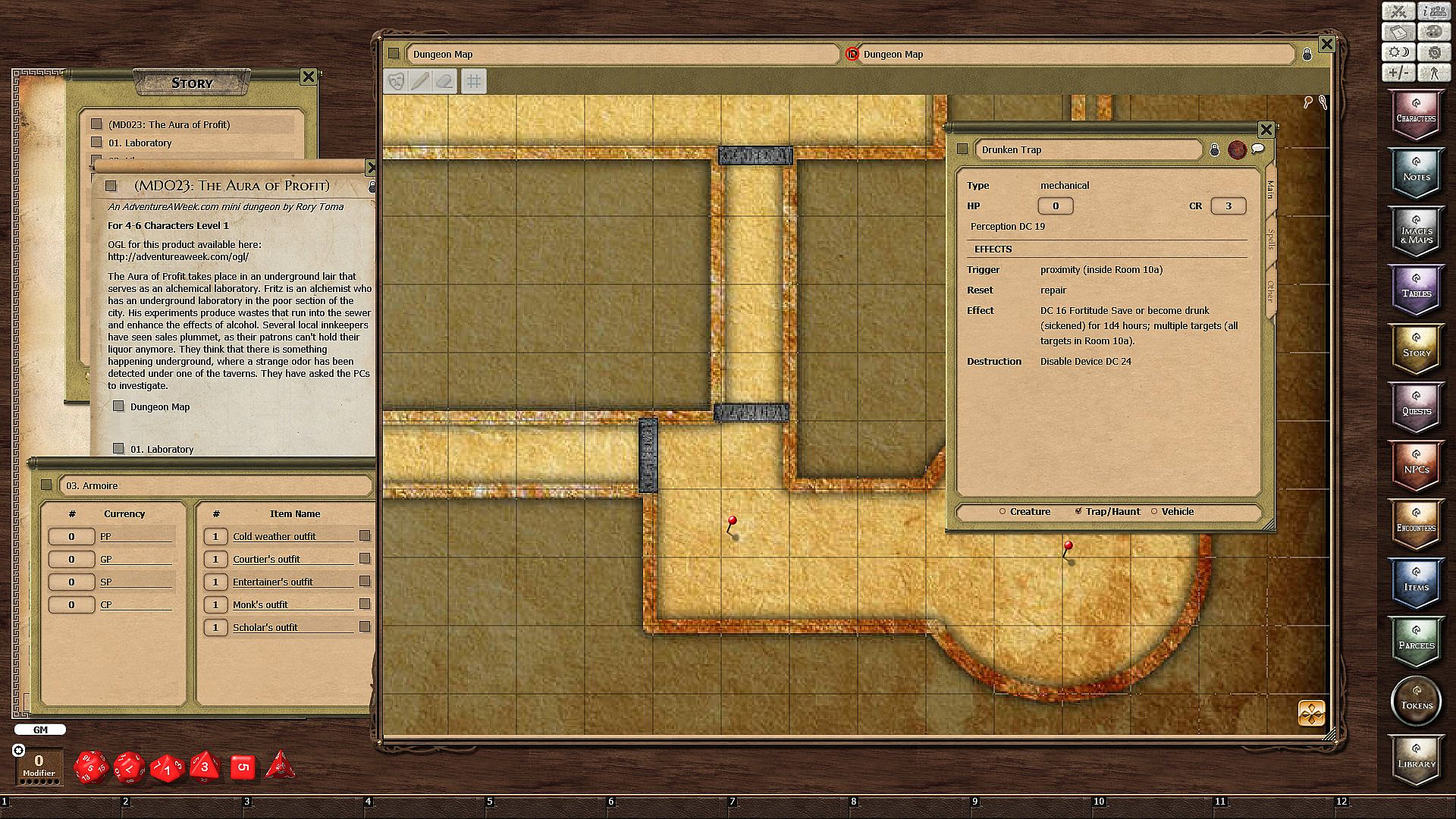 The Aura of Profit takes place in an underground lair that serves as an alchemical laboratory. Fritz is an alchemist who has an underground laboratory in the poor section of the city. His experiments produce wastes that run into the sewer and enhance the effects of alcohol. Several local innkeepers have seen sales plummet, as their patrons can’t hold their liquor anymore. They think that there is something happening underground, where a strange odor has been detected under one of the taverns. They have asked the PCs to investigate.