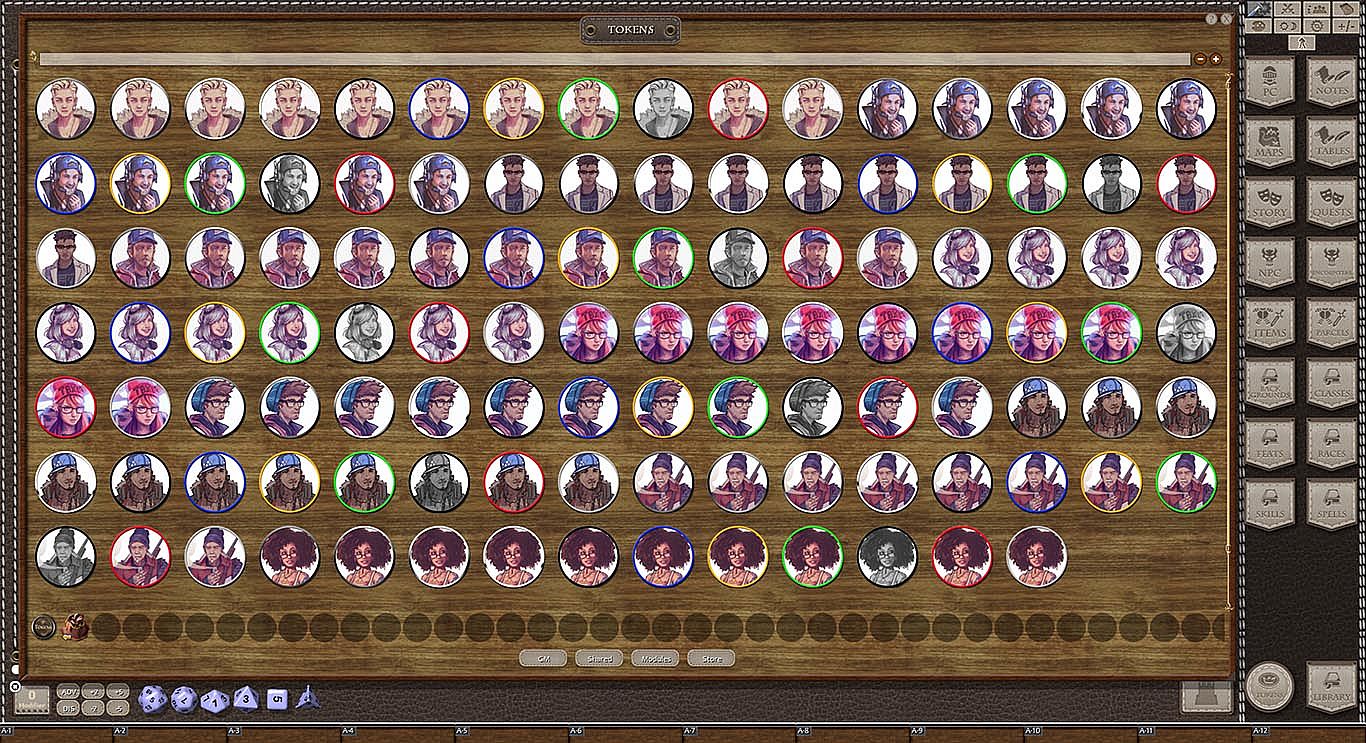 This token pack includes (ringed in black, blue, gold, green, greyscale, full body, and silver):