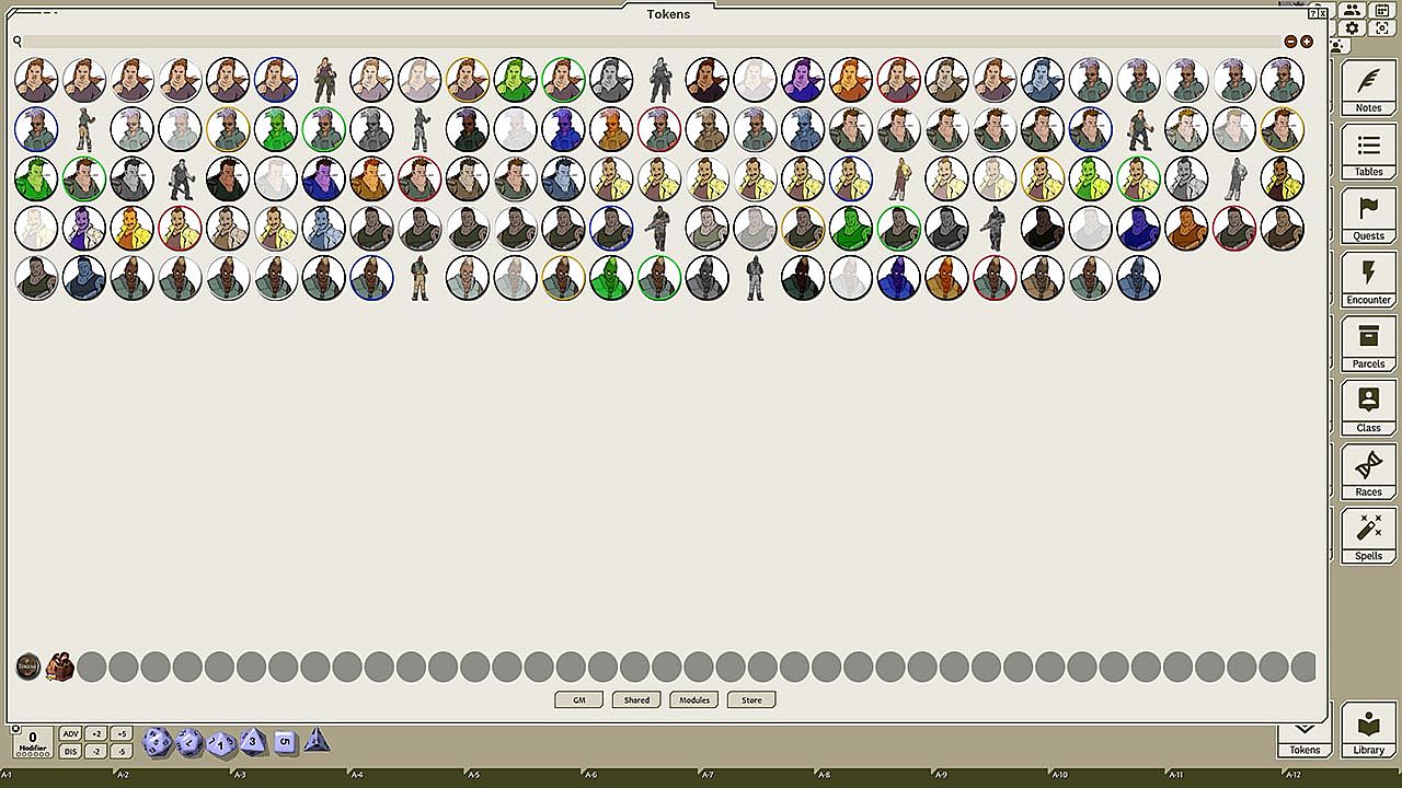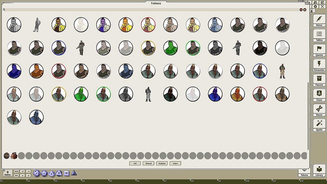 This token pack includes (ringed in black, blue, gold, green, greyscale, and silver, as well as ethereal, invisible, stone-skinned, sand-skinned, and altered state versions):