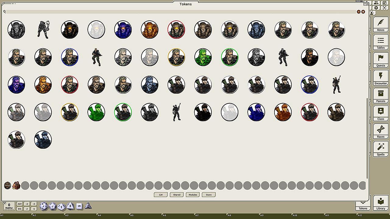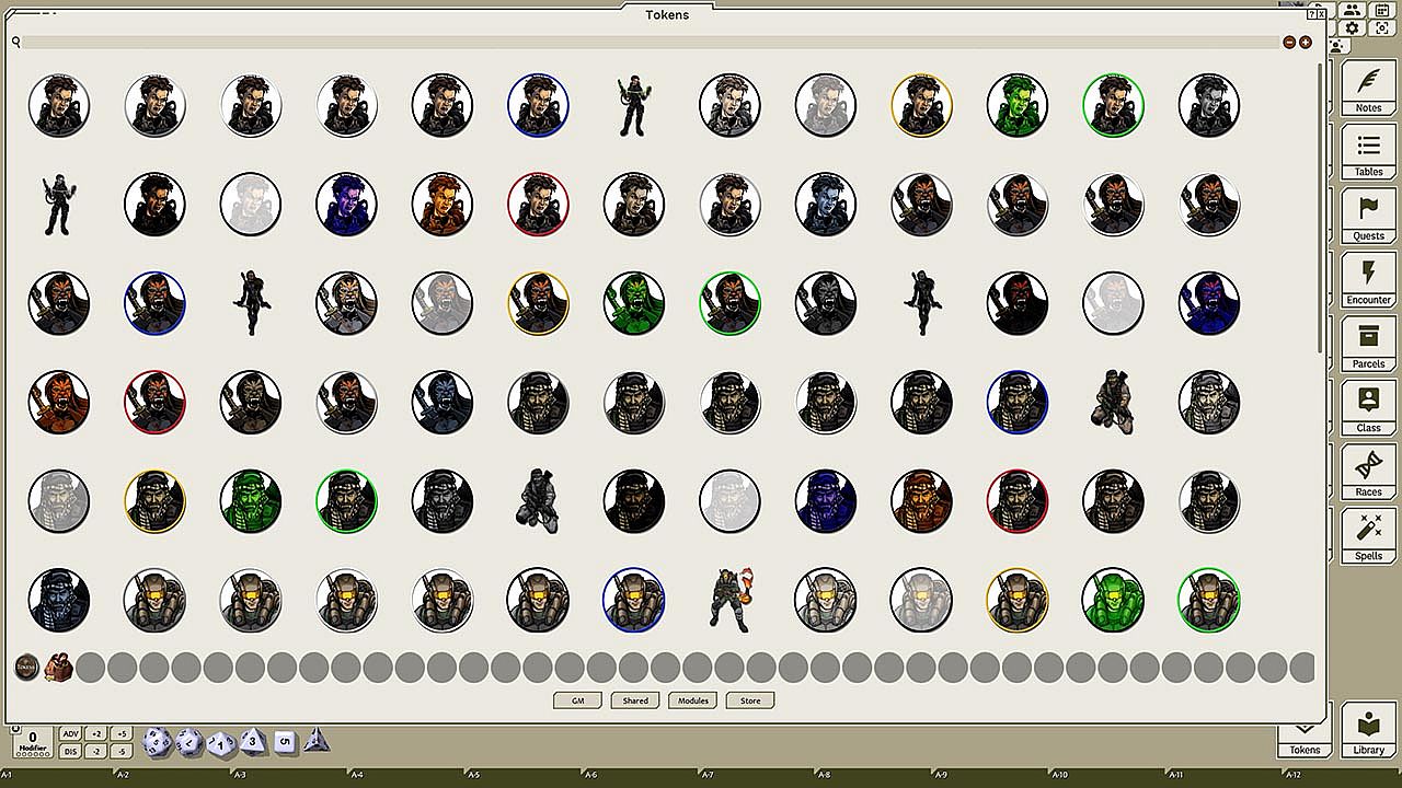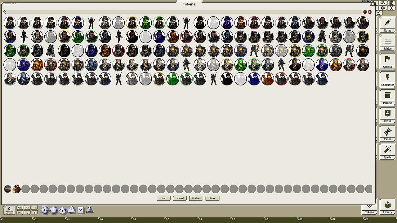 This token pack includes (ringed in black, blue, gold, green, greyscale, and silver, as well as ethereal, invisible, stone-skinned, sand-skinned, and altered state versions):