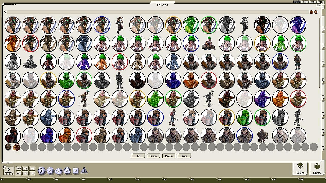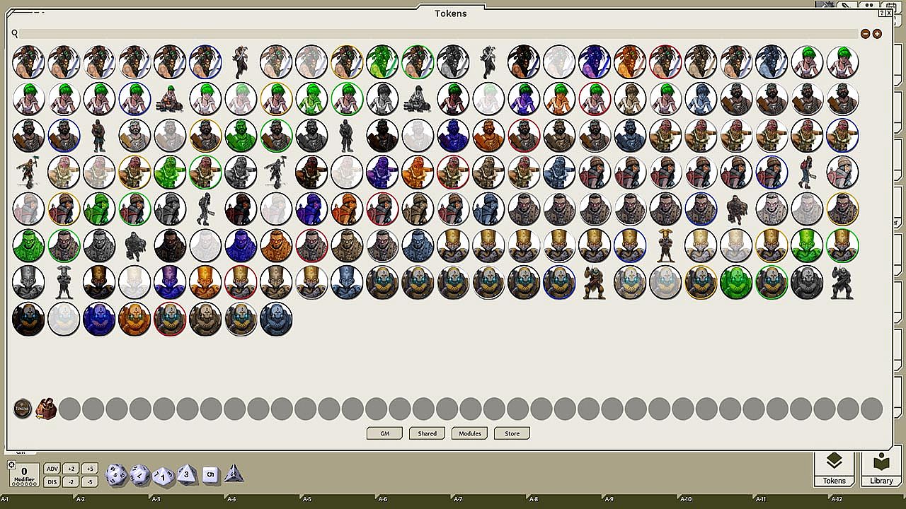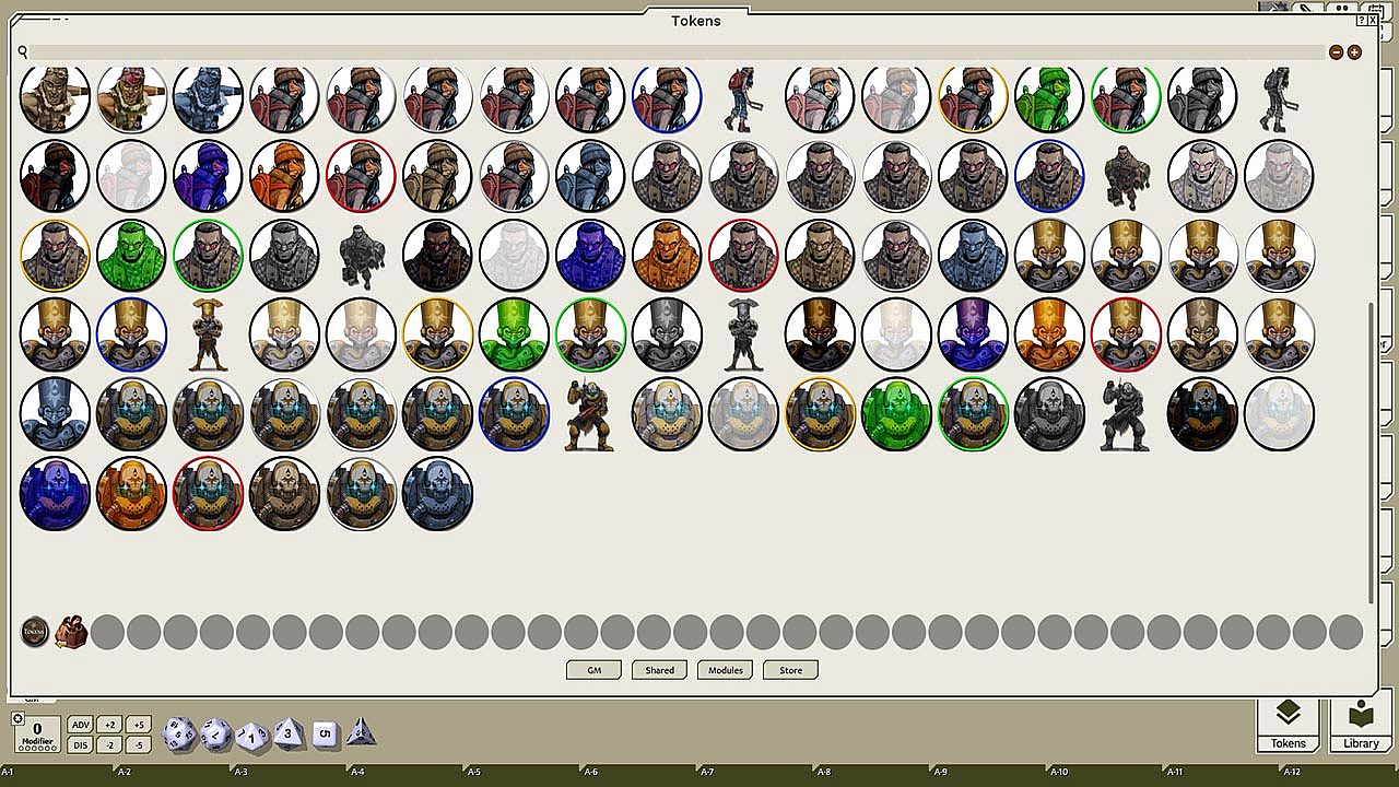 This token pack includes (ringed in black, blue, gold, green, greyscale, and silver, as well as ethereal, invisible, stone-skinned, sand-skinned, and altered state versions):