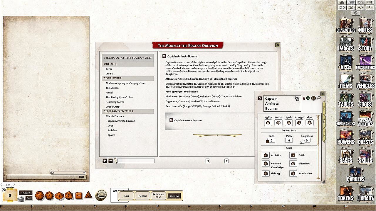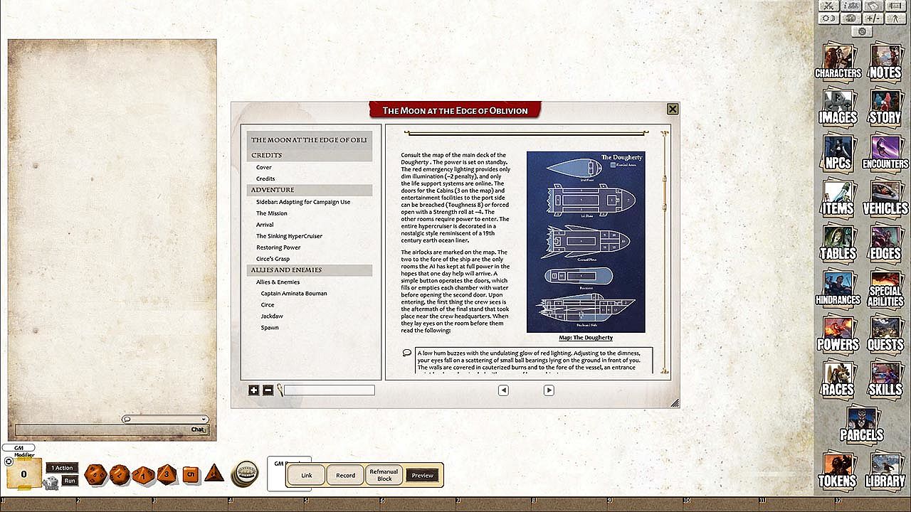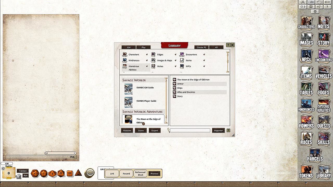 Moon at the Edge of Oblivion is a Savage Tale for the Savage Worlds roleplaying game system. A copy of Savage Worlds Adventure Edition is optimal.