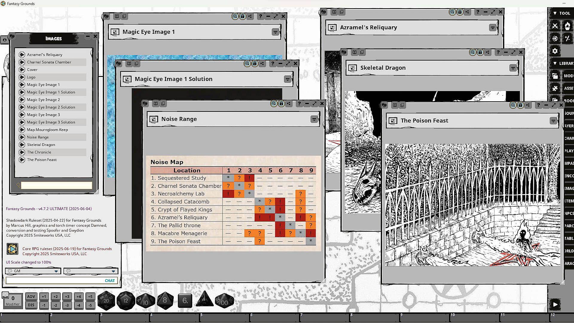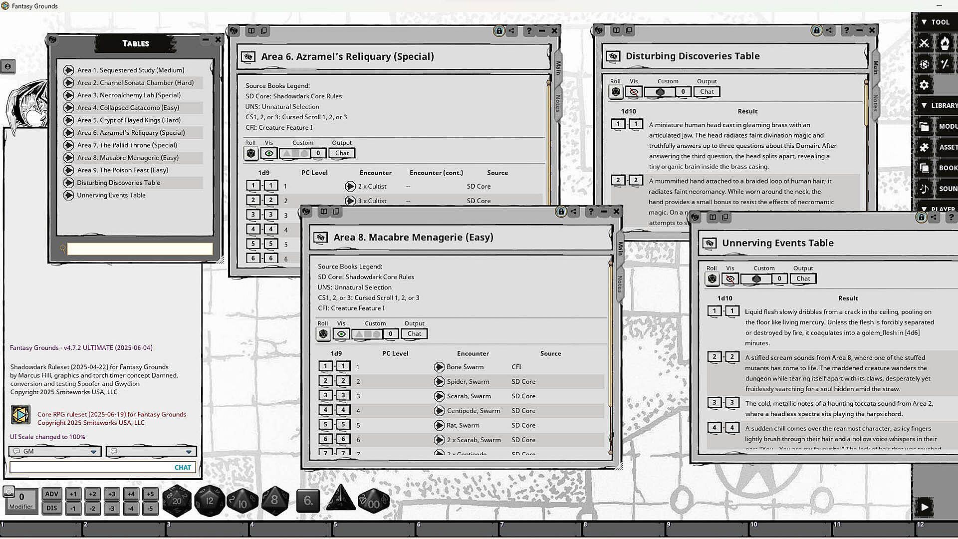 Products from Bolwerk Publishing do not use A.I. 'art', A.I.-generated writing, or A.I. assistance/prompts of any kind. All Dungeon Domains are 100% created by humans, for humans. The Fantasy Grounds adaptation of this product does not contain any A.I.-generated images, including NPC tokens. Therefore, combat encounters (which include tokens) are not included. In place of combat encounters, lists of links to NPC records in external sources are provided. Ownership of the original products is required in order to open these NPC records. The following products were used: