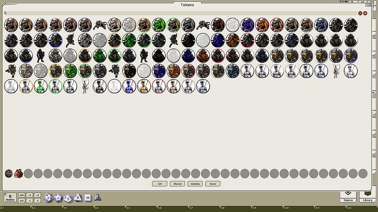 This token pack includes (ringed in black, blue, gold, green, greyscale, and silver, as well as ethereal, invisible, stone-skinned, sand-skinned, and altered state versions):