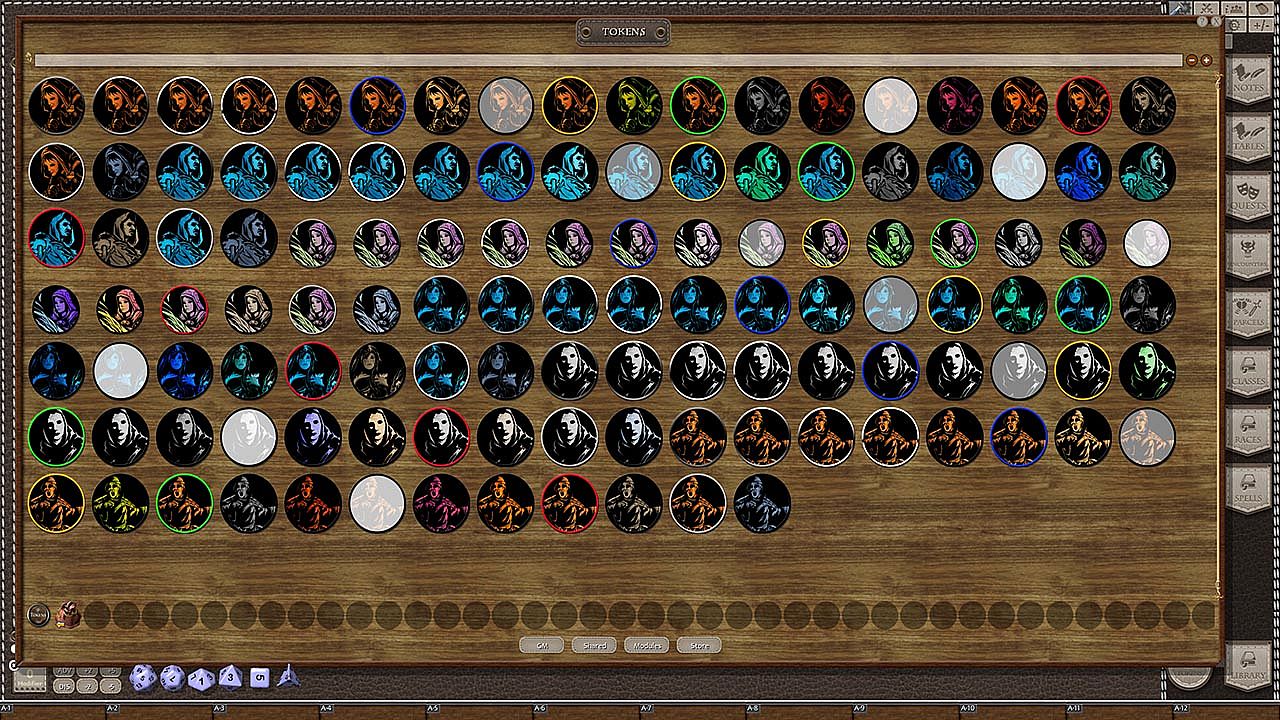 This token pack includes (ringed in black, blue, gold, green, greyscale, and silver, as well as ethereal, invisible, stone-skinned, sand-skinned, and altered state versions):