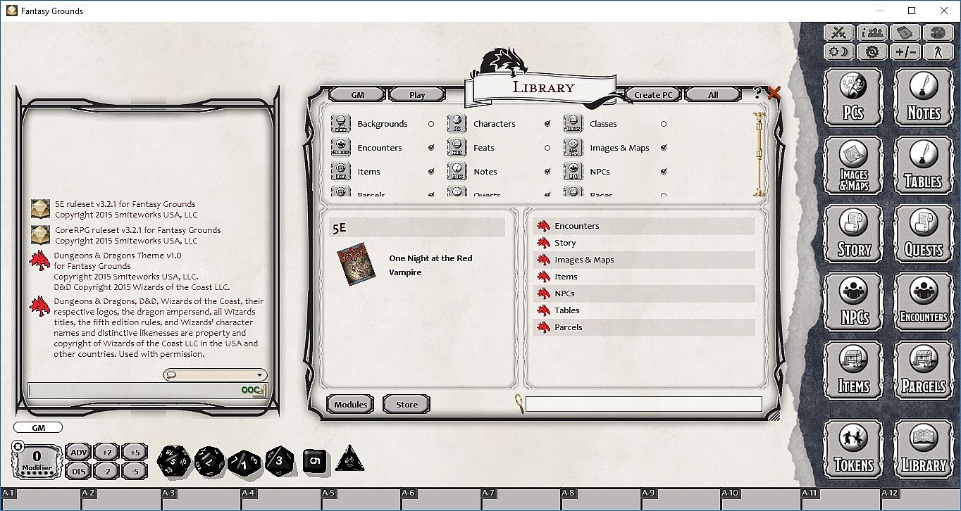 Requirements: An active subscription or a one time purchase of a Fantasy Grounds Full or Ultimate license and the included 5E ruleset.
