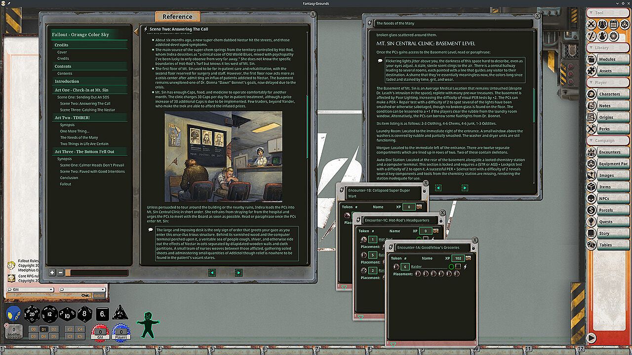 A distress call echoes from Mt. Sin Central, an ancient hospital overrun by chem-addicts in a ruined city. Doctors and caregivers struggle to treat resistant patients as supplies vanish and a nearby raider gang fuels the crisis. Players step in to aid the overworked staff, tackling this Fallout: The Roleplaying Game quest adapted for Fantasy Grounds on PC. This 22-page adventure unfolds in three acts across character levels 6-10, blending strategy, indie RPG elements with hospital exploration and surrounding urban spots. Teams navigate medics, patients, and key locations to resolve the spreading problem. It fits any urban campaign, drawing RPG groups ready for mid-level challenges in a post-apocalyptic clinic.