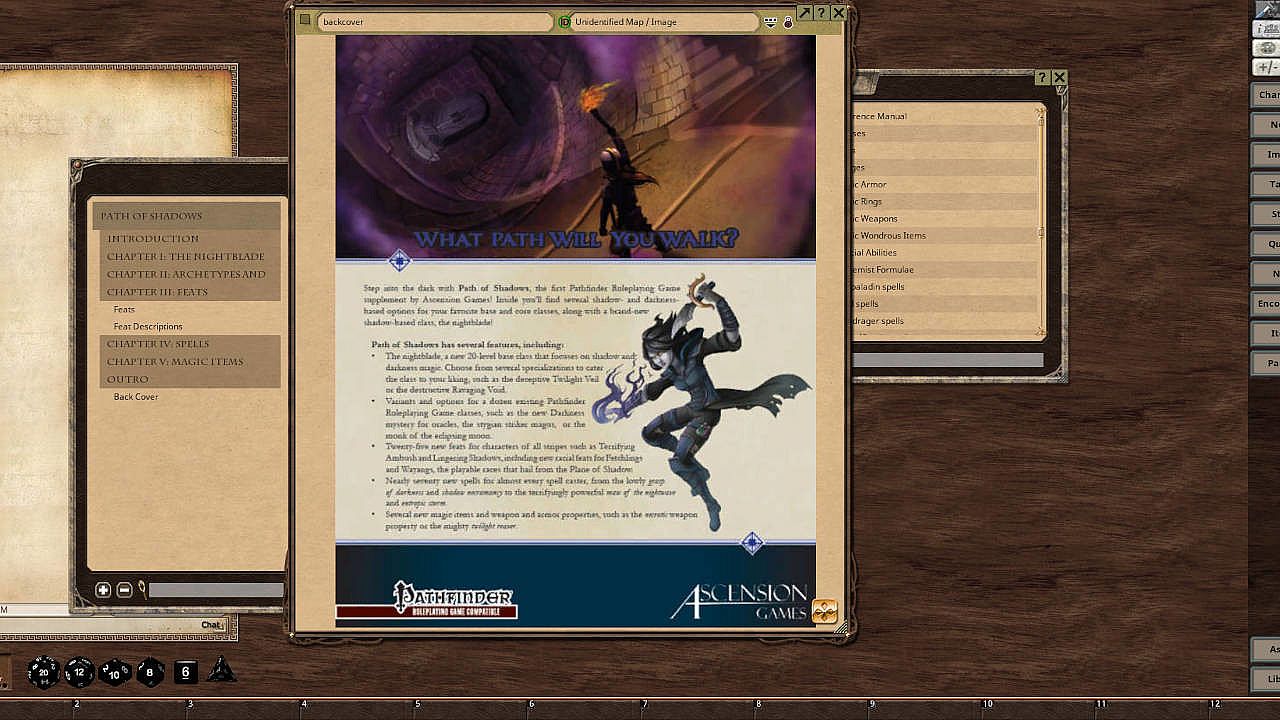 What path will you walk?Step into the dark with Path of Shadows, the first Pathfinder Roleplaying Game supplement by Ascension Games! Inside you'll find several shadow- and darkness-based options for your favorite base and core classes, along with a brand-new shadow-based class, the nightblade!