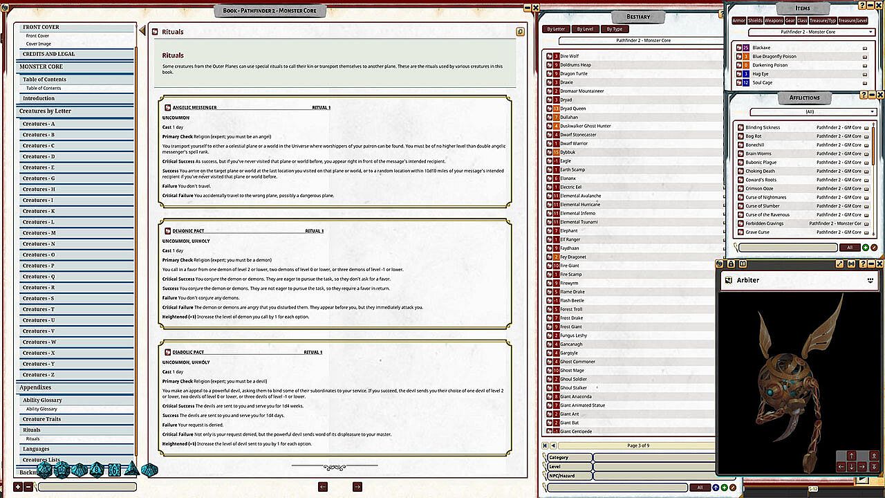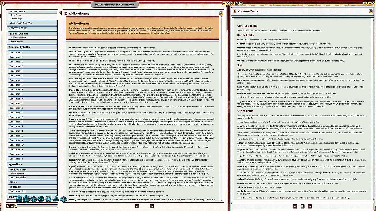 - Easy use tabs, links, and lookups for reference to the abilities and features found within the Bestiary