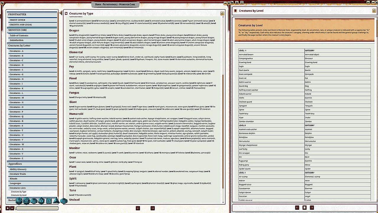 - Lists of creatures sorted by both type and level, making it easy to find the monster you need when you need it.
