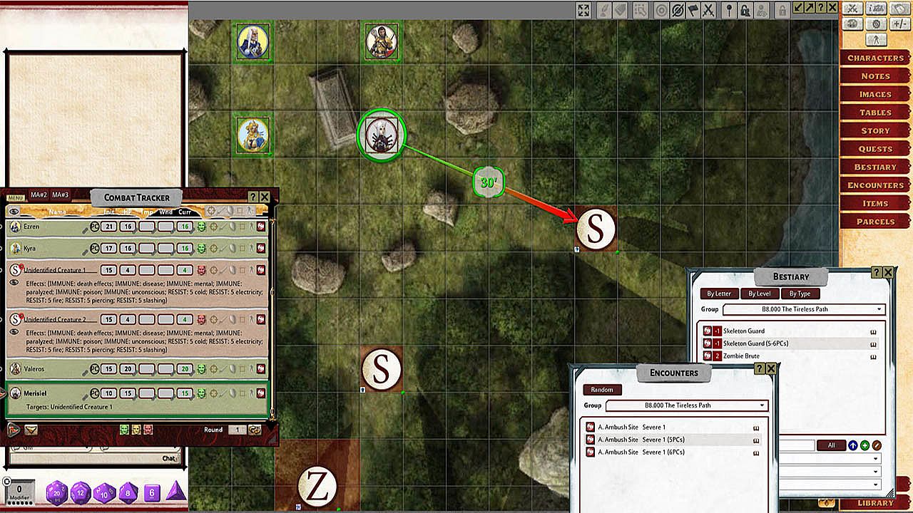 - Tokens for each encounter are all pre-placed in starting locations on the map. You can edit these on the fly.