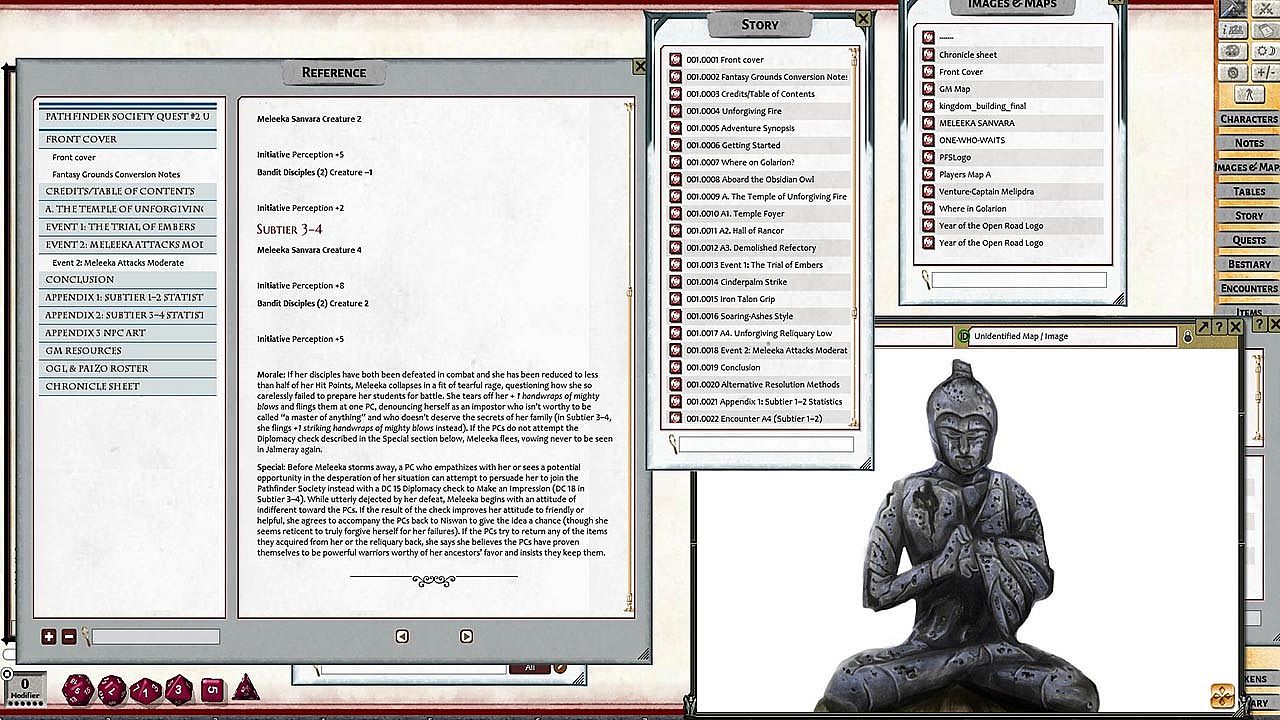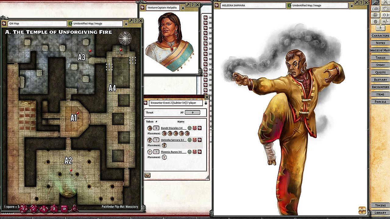 Pathfinders answer Venture-Captain Rashmivati Melipdra's call to recover a stolen relic from a rogue monk on the lawless island of Veedesha. This Pathfinder Society Quest for levels 1-4 (subtiers 1-2 and 3-4) unfolds in Fantasy Grounds, where players navigate to the bandit-controlled shores and confront the new Monastery of Unforgiving Fire. The RPG adventure draws on strategy through pre-set maps with grids, linked area descriptions, pre-placed tokens, drag-and-drop treasure parcels, and shareable handouts. GMs manage combats and encounters seamlessly with editable tokens and XP awards. Players tackle the quest's challenges in a structured virtual tabletop setup. This indie RPG suits groups ready for organized Pathfinder 2nd Edition sessions requiring a Fantasy Grounds license and ruleset.