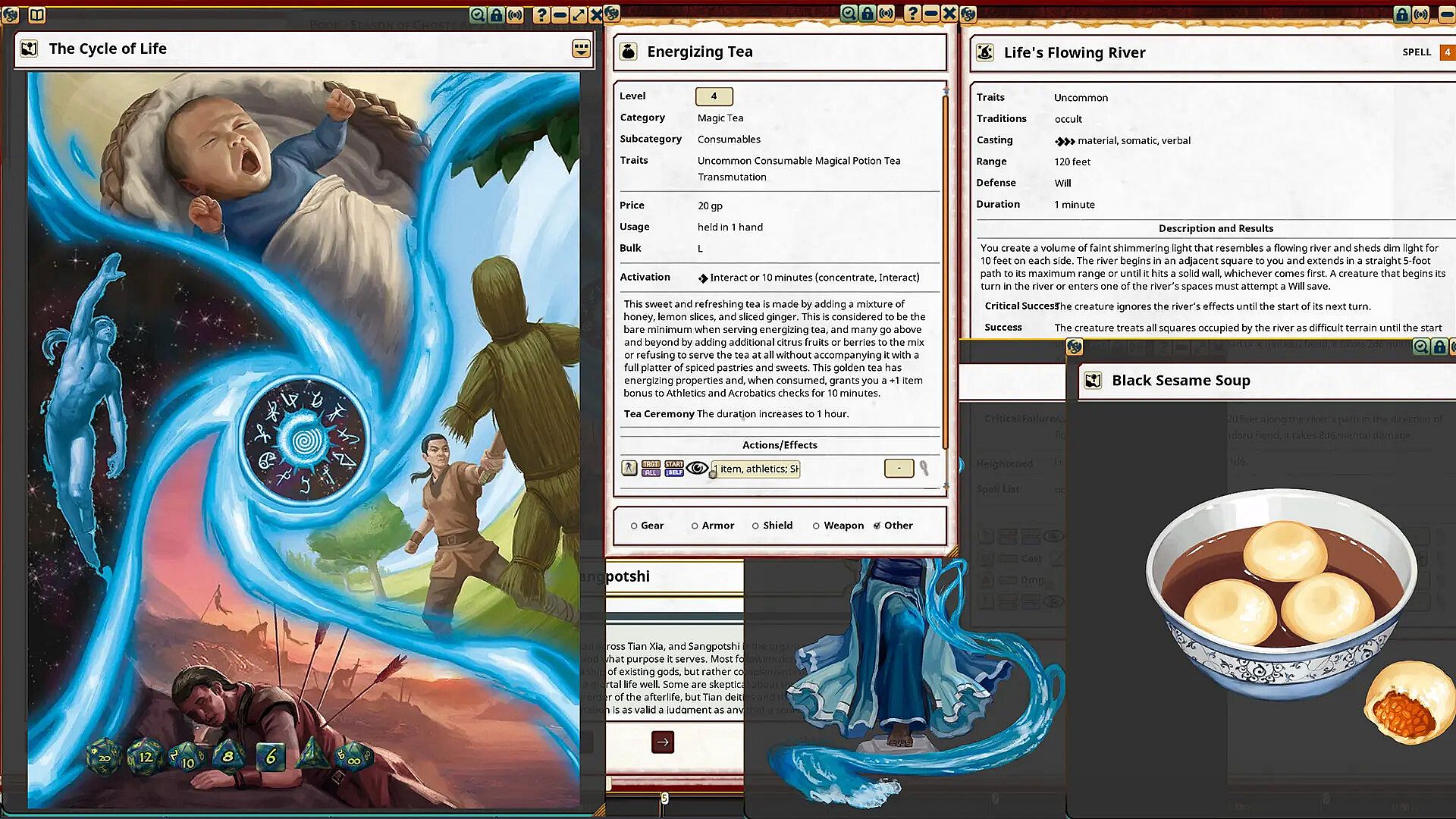 Let the Leaves Fall is a Pathfinder adventure for four 4th-level characters. This adventure continues the Season of Ghosts Adventure Path, a four-part monthly campaign inspired by Asian horror in which a band of adventurers must protect their hometown from supernatural peril. This adventure also includes articles about a local autumnal festival and the reincarnation-focused philosophy of Sangpotshi, new magic items, spells, and rituals to be discovered, and a mix of supernatural monsters to menace your PCs.