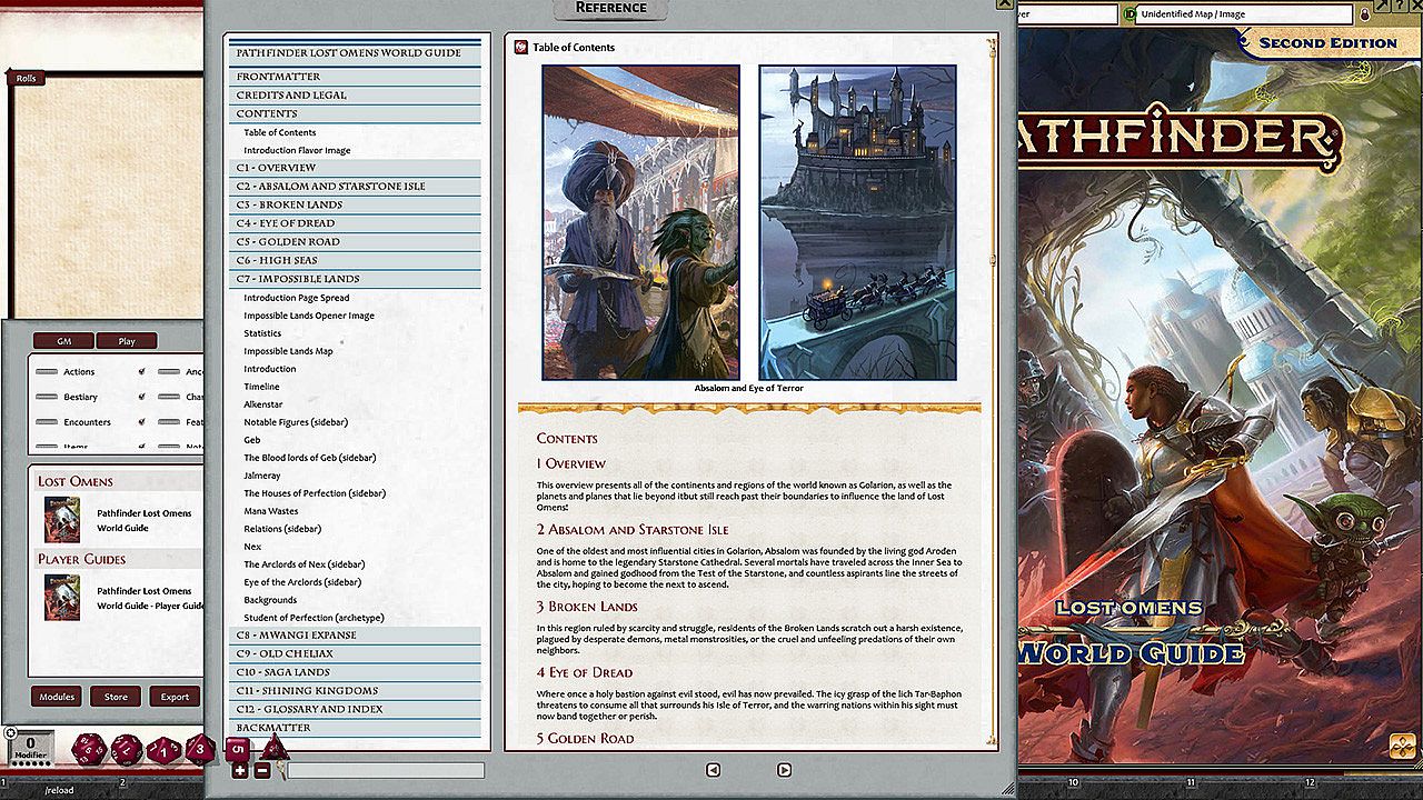 The product includes a player guide module which contains player specific details (high levels maps, backgrounds, archetypes, spells and weapon records), and the full guide aimed for the GM's use (including 178 maps and images which can be shared with the players as needed).
