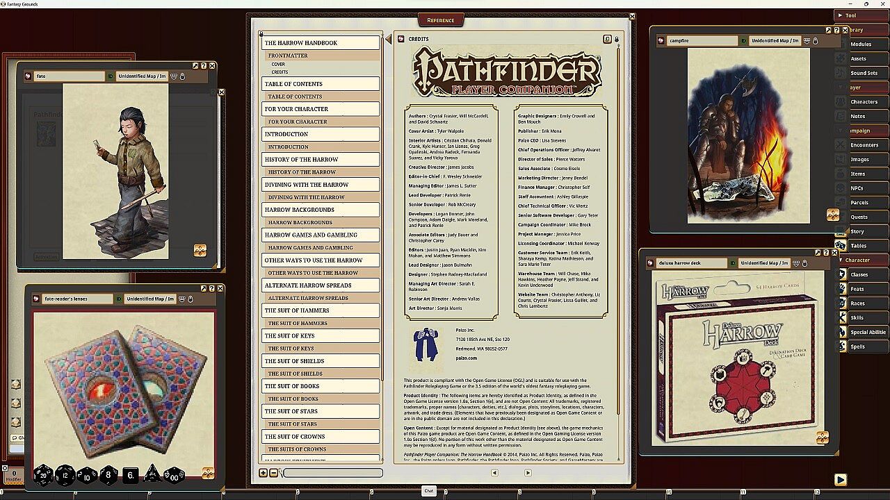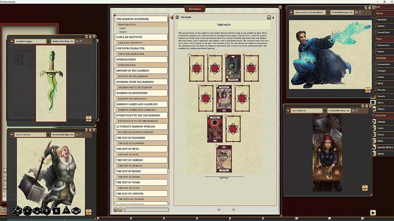 Pierce the veil of mystery surrounding the occult symbolism of the harrow! Steeped in ancient tradition, harrow decks have been used for centuries to foretell the future, perform magical feats, send coded messages and warnings, and manipulate fate. Divine your fortune, learn games of skill and chance, summon allies, curse enemies, or even build a character based on harrow archetypes as you delve into the lore and secrets of the cards.