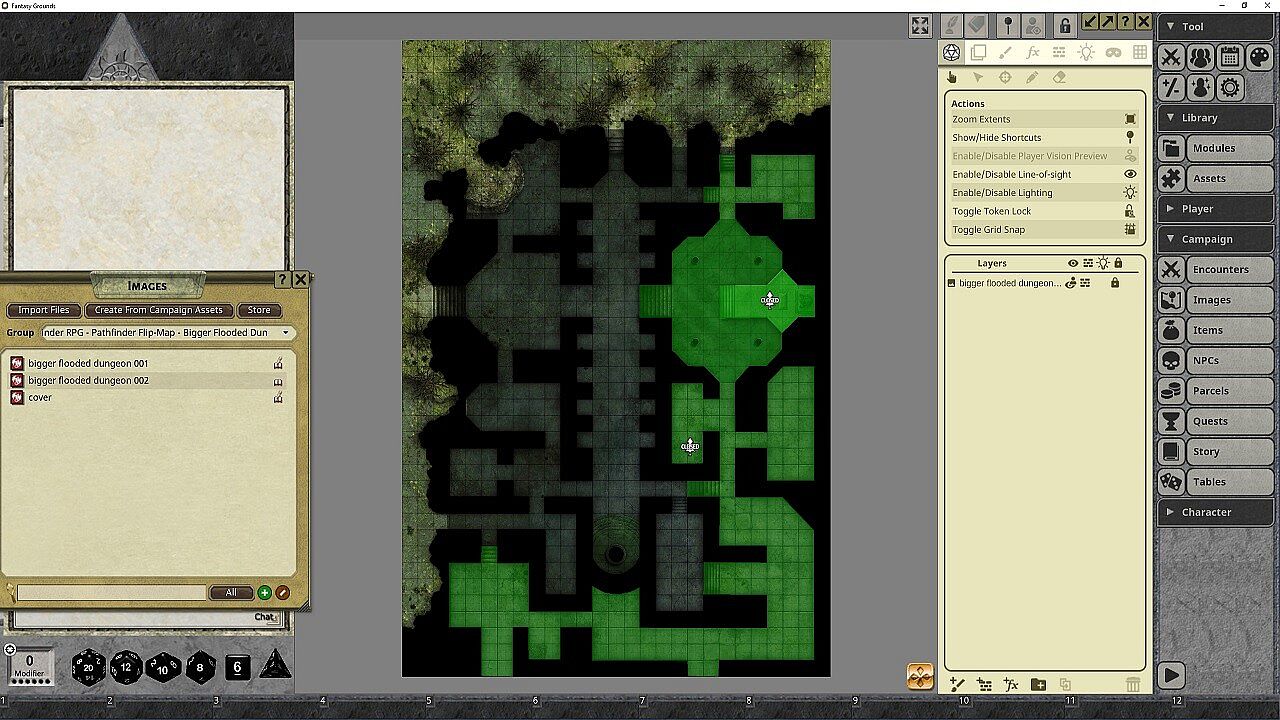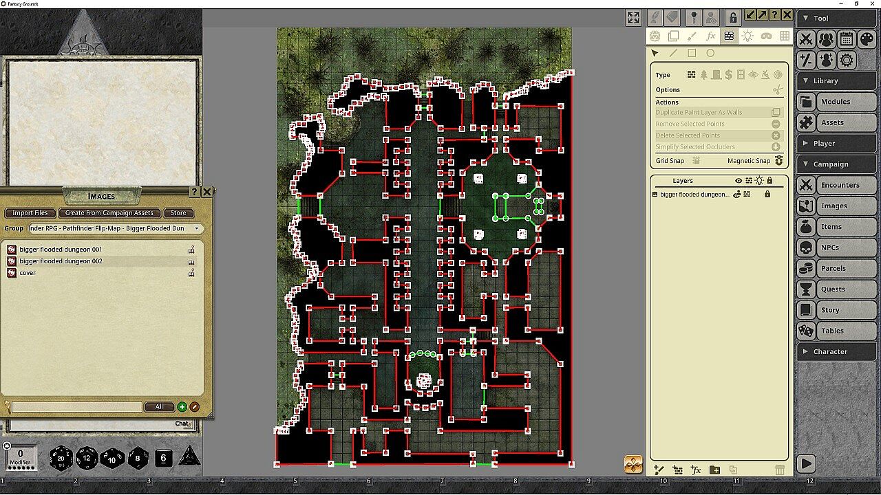Not all dungeons stay dry and dusty. Pathfinder Flip-Mat: Bigger Flooded Dungeon delivers maps of moist caverns, including a sunken complex amid a swamp and an ancient structure swamped by a spring. Fantasy Grounds users access these ready-to-play grids for quick sessions. Maps come resized with preset grids to handle combats smoothly. Images and handouts sit ready to share with players. This RPG tool suits Pathfinder ruleset groups, plus 5E, Starfinder, or any Fantasy Grounds-supported system, on PC.