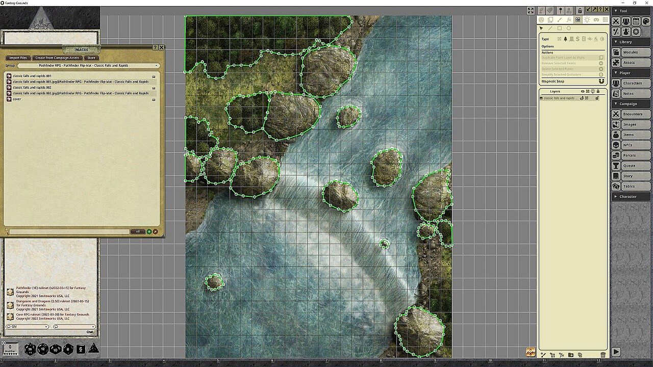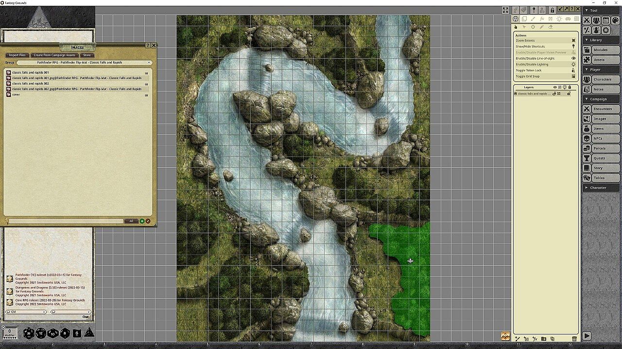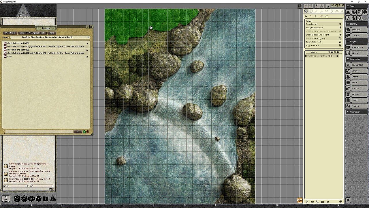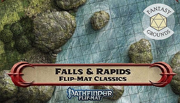 Whether your party is at the mercy of deadly rapids or is headed toward a plummet over a crushing waterfall, no Game Master wants to slow the action down by drawing every river bend and jagged rock. Fortunately, you don't have to! This line of gaming maps provides ready-to-use and captivatingly detailed fantasy set pieces for the busy Game Master. Whether the heroes are in flight or pursuit, these combat maps features rapids, rocky bends, misty falls, and ambush spots aplenty! Don't waste your time sketching when you could be playing. With Pathfinder Flip-Mat: Falls & Rapids, you'll be ready next time your players find themselves up the river without a paddle!NOTE: This product has been made specifically for the Pathfinder ruleset, but can be used for 5E, Starfinder, or any ruleset supported by Fantasy Grounds