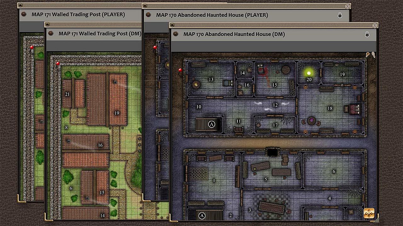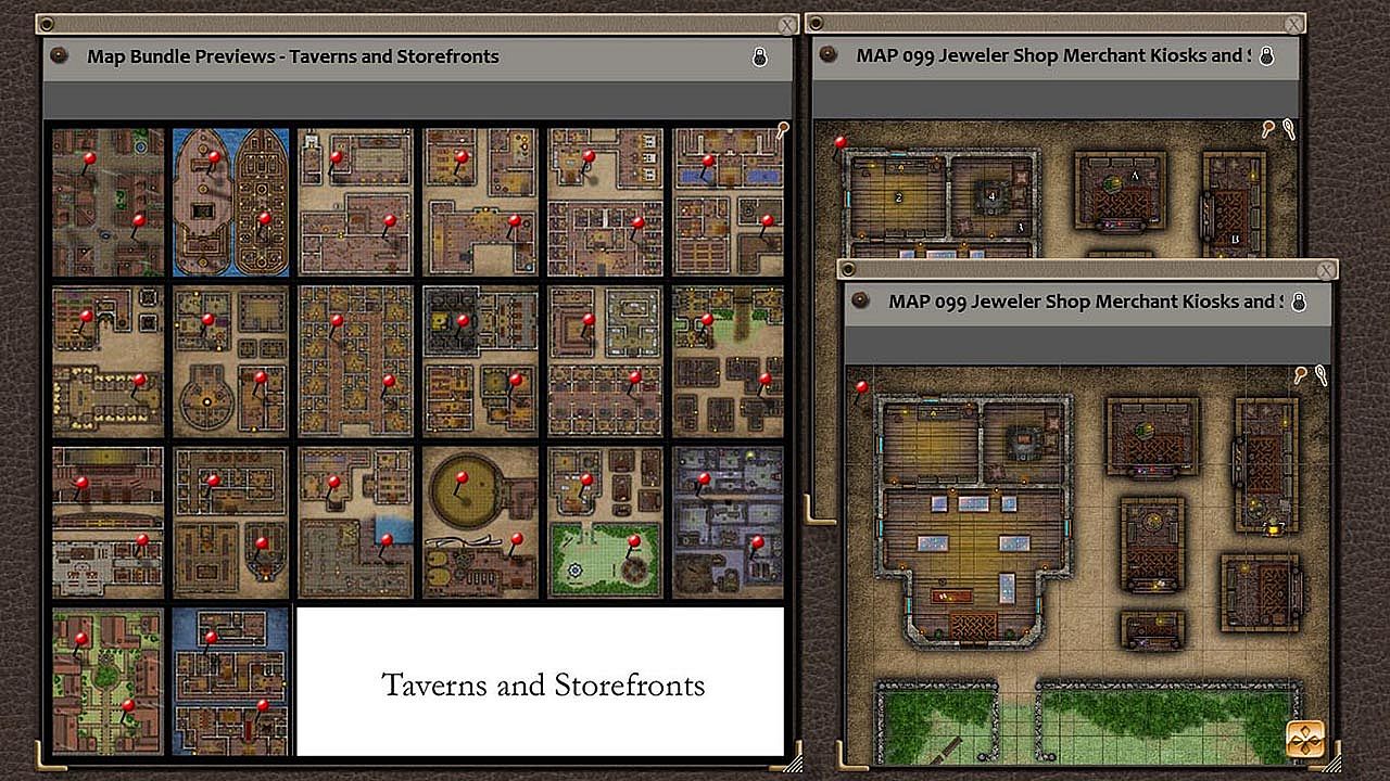 This collection of maps custom is built for the Fantasy Grounds virtual tabletop and includes 20 incredible maps related to Taverns and Storefronts for use in your campaign. Both GM and Player maps are included.